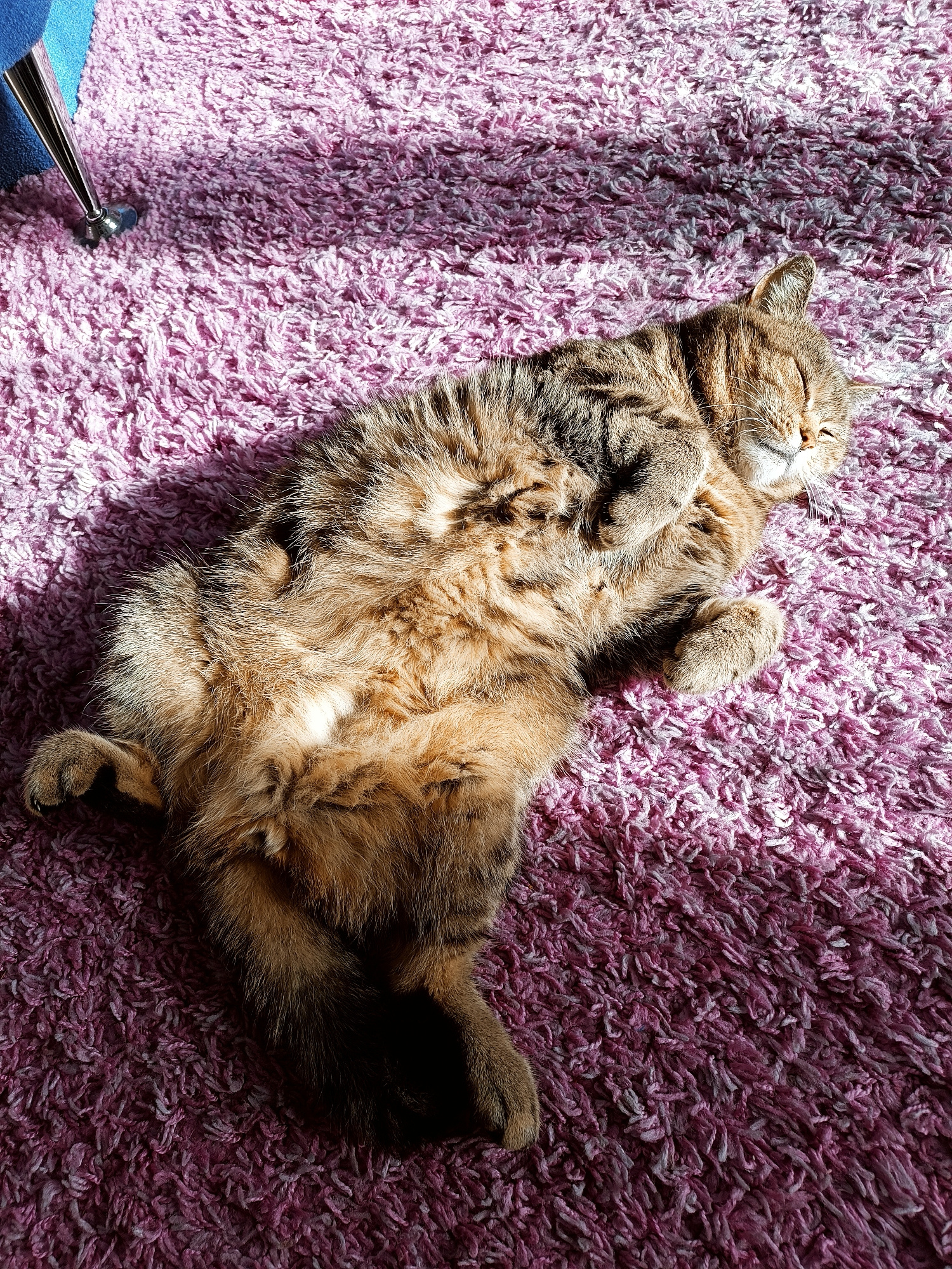 A tabby cat is lying on its back on a purple shag carpet in what appears to be a home interior. The cat is positioned in the center of the frame, with its eyes closed and paws curled up. Sunlight illu…read more