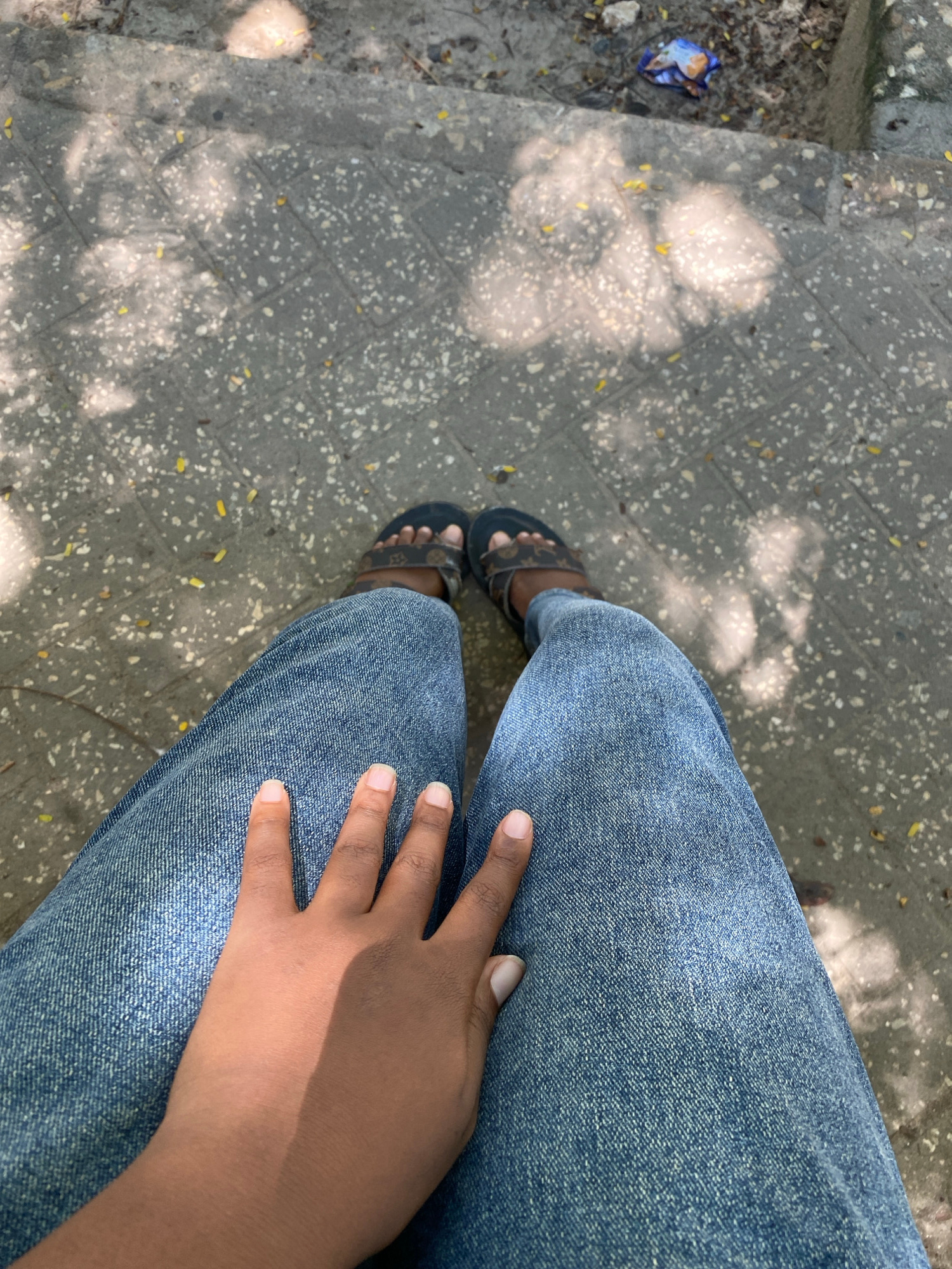 A photograph taken from an elevated perspective shows a person sitting on an outdoor ledge or step, likely in an urban environment. The individual is wearing blue denim jeans and dark-colored sandals.…read more