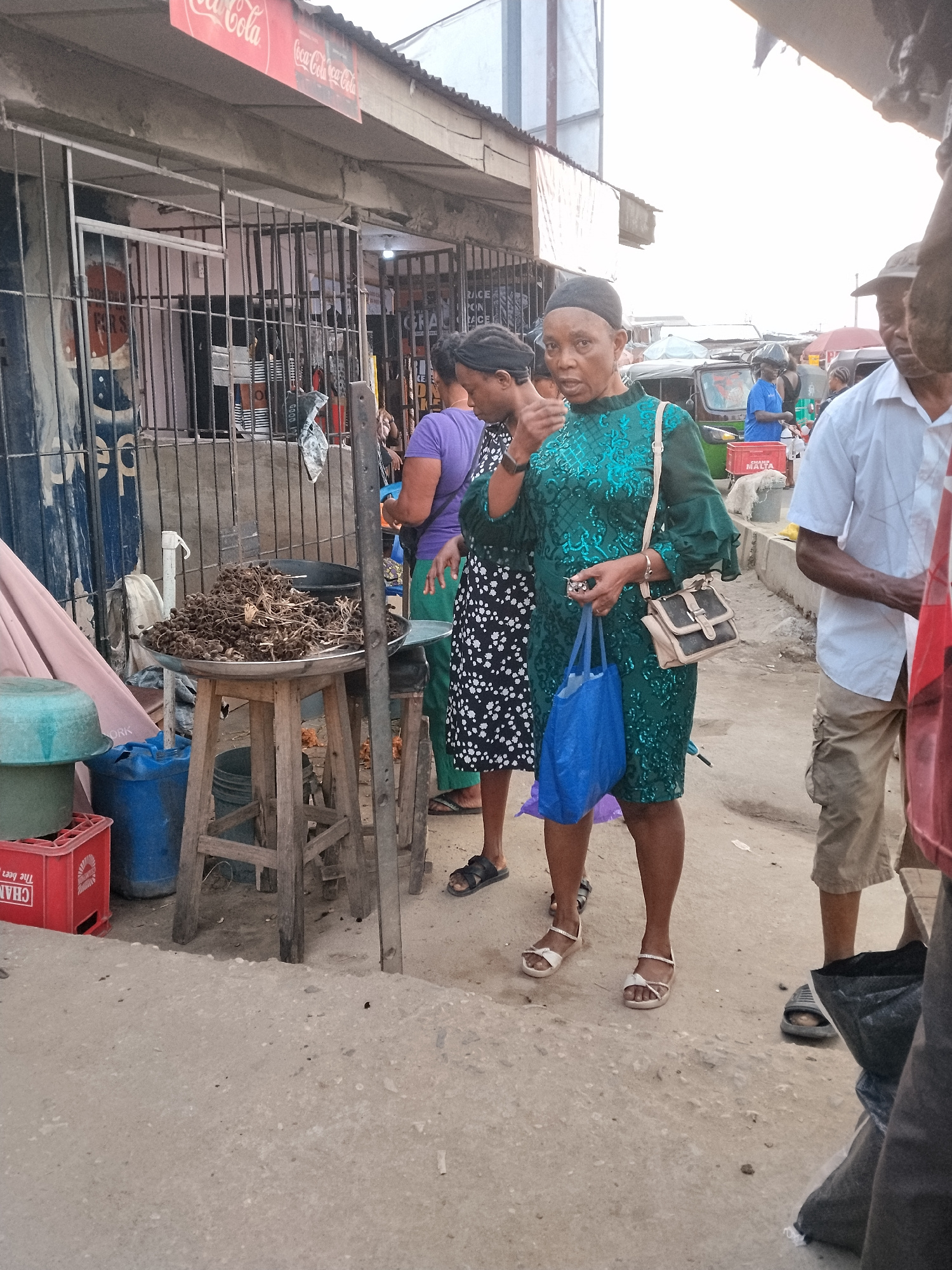 The image captures a street scene in Aba, Nigeria. A woman in a green dress and sandals stands prominently, holding a blue bag and a small purse. She is looking directly at the camera with a serious e…read more