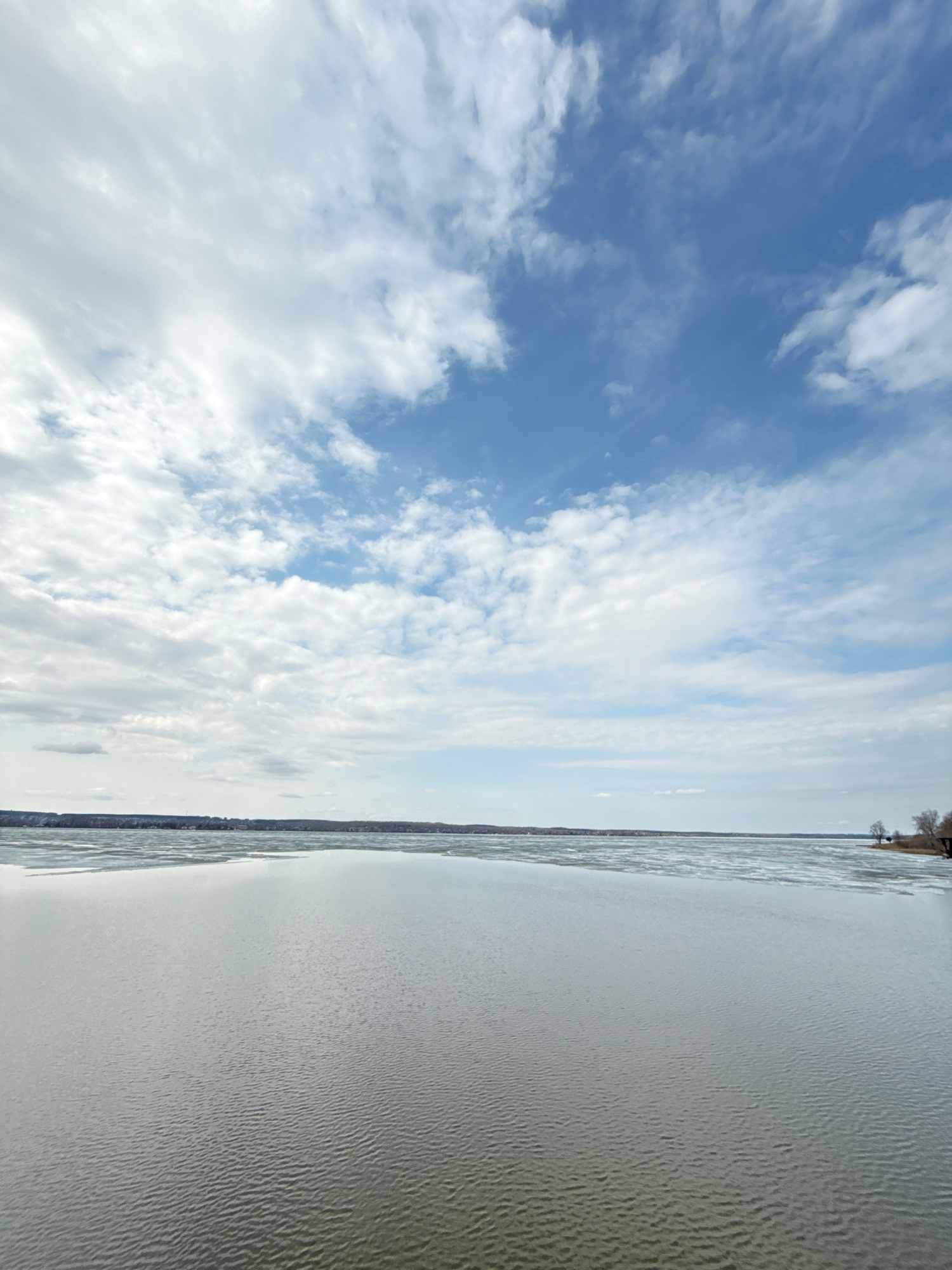 The image shows a view of the Votkinsk Reservoir in Votkinsk, Russia, with a predominantly cloudy sky occupying the left side of the frame and the reservoir stretching towards the right. The water sur…read more