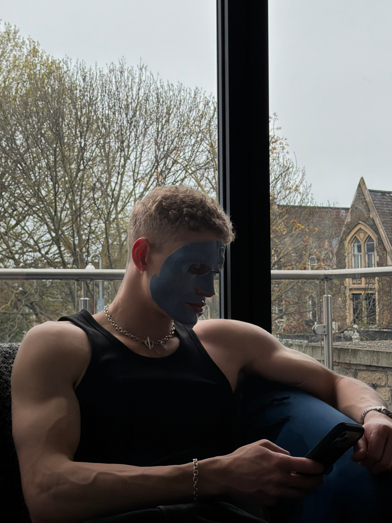 A man sits, facing right, in front of a window, wearing a black tank top, jewelry, and a blue facial mask. He holds a cell phone in his left hand. Behind him, visible through the window, is a tree wit…read more