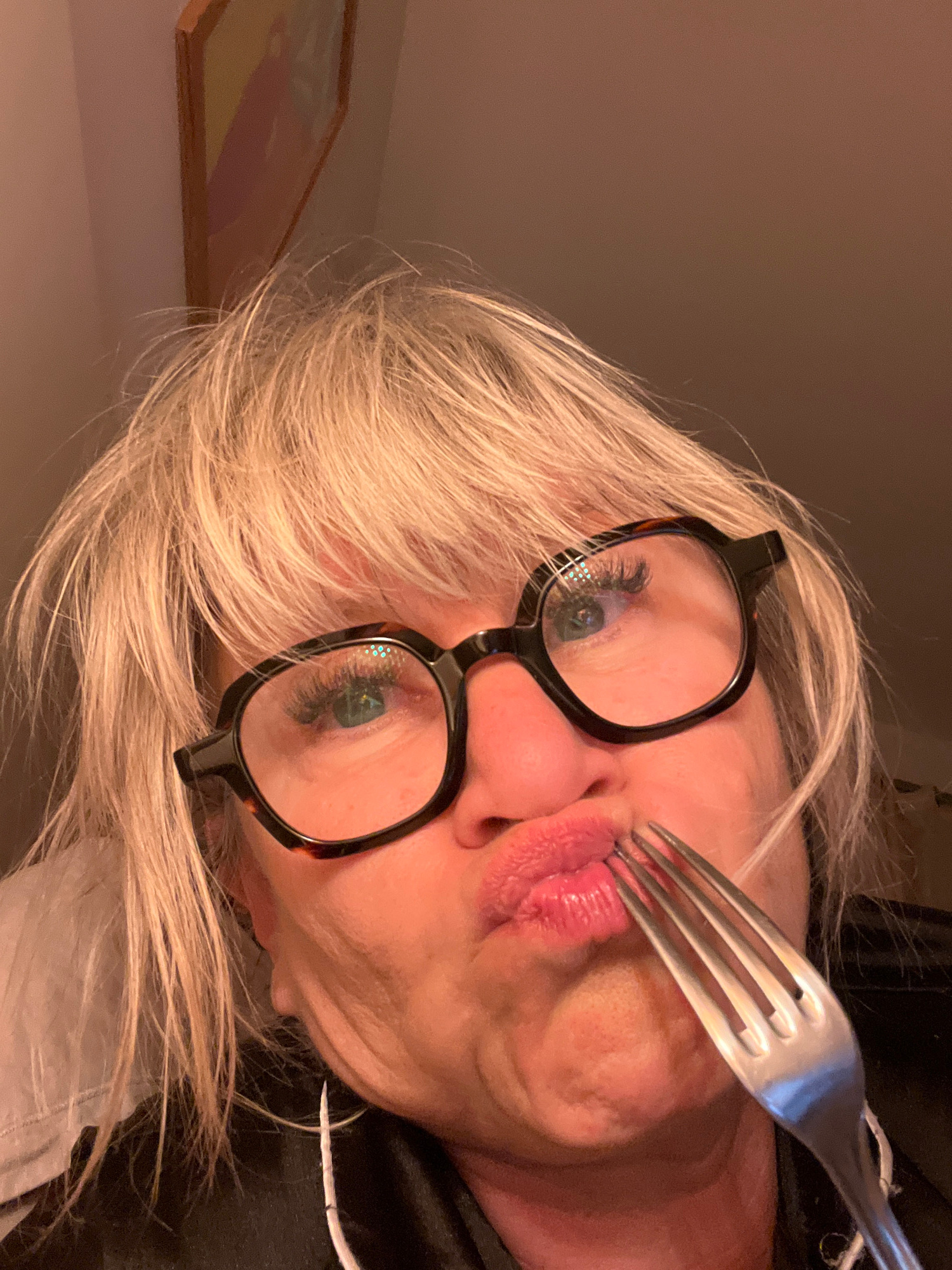 A woman with short, light blonde hair and tortoise-shell framed glasses is holding a silver fork to her pursed lips. The scene is indoors. A piece of artwork hangs on the wall in the background. The l…read more