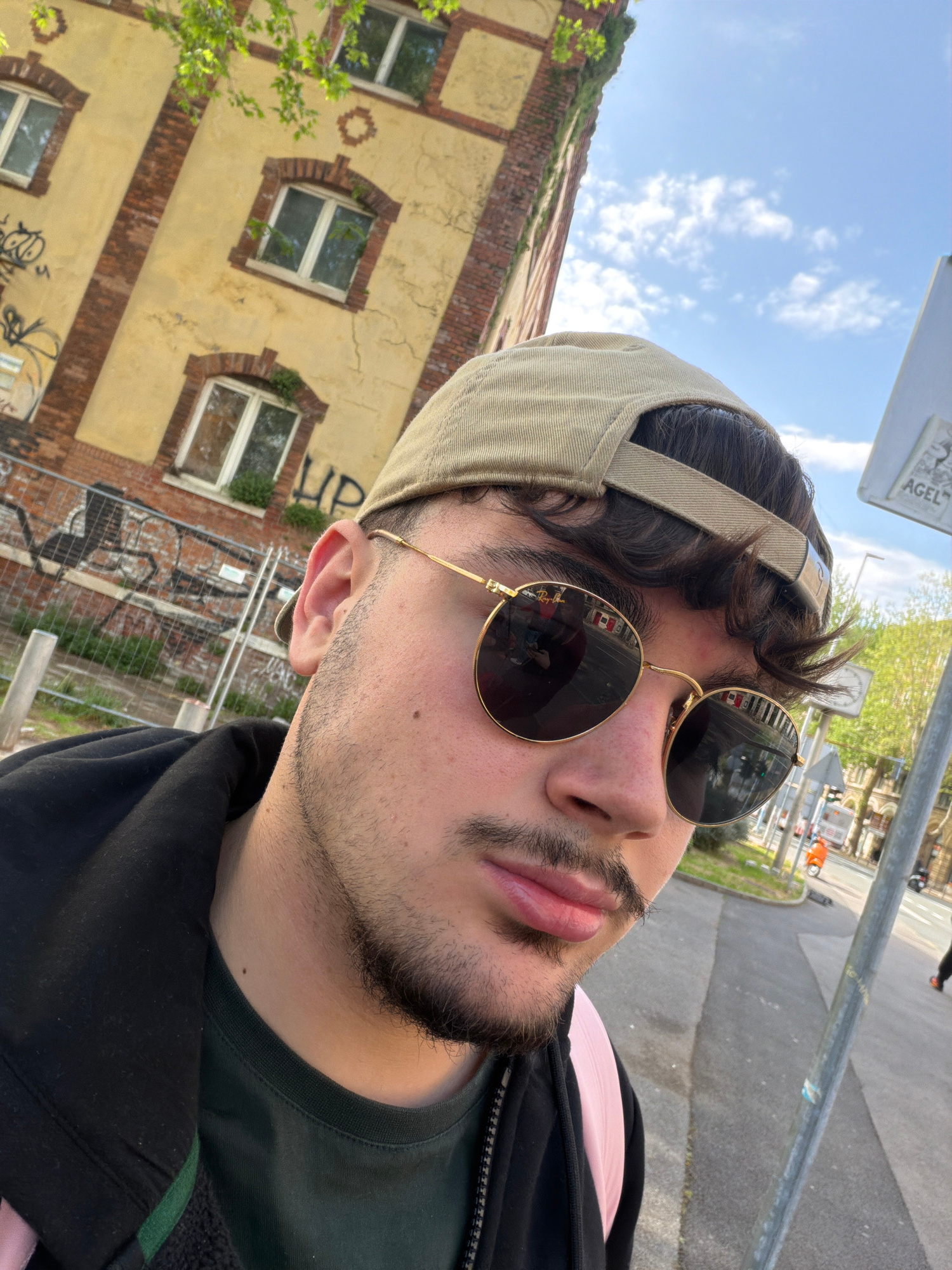 A young man is depicted in a selfie-style photograph taken outdoors. He is wearing a tan baseball cap, round-rimmed sunglasses, a dark green shirt, and a black jacket, and he has a beard and mustache.…read more