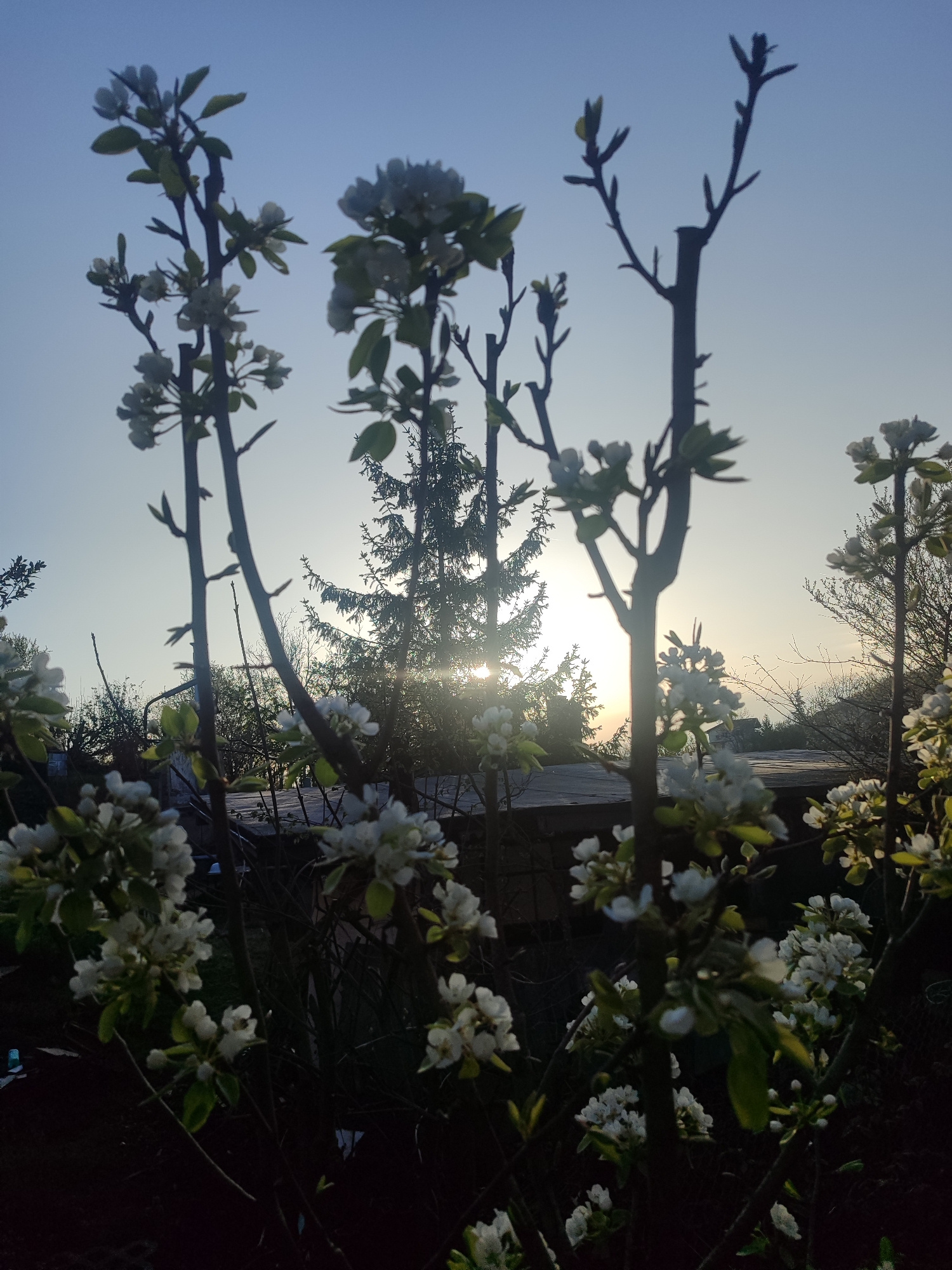 This vertical photograph captures a tranquil outdoor scene at either sunrise or sunset in Varshilo, Bulgaria. The foreground is dominated by the silhouetted branches of multiple blooming trees or shru…read more