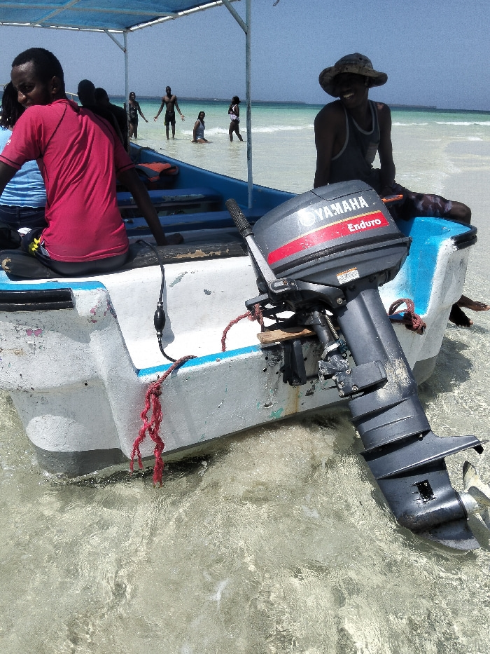 The scene depicts a small, white and blue open motorboat positioned in shallow, clear, light turquoise water near the coast of Wasini, Kenya, under a clear blue sky. The boat features a light blue can…read more