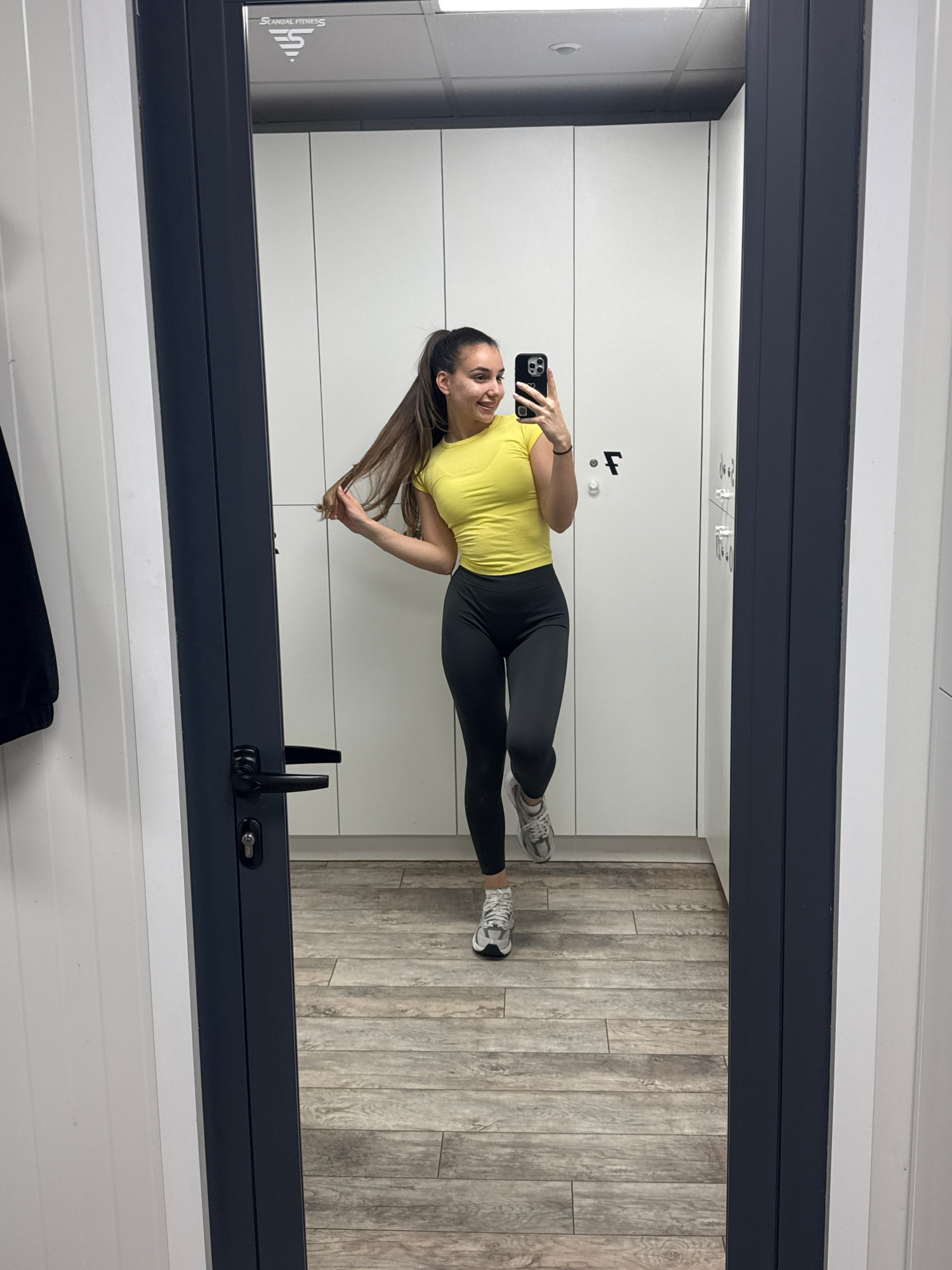 A woman is taking a selfie in what appears to be a changing room. She is wearing a yellow shirt and dark leggings, along with grey sneakers. She holds a phone in her right hand and is partially twisti…read more