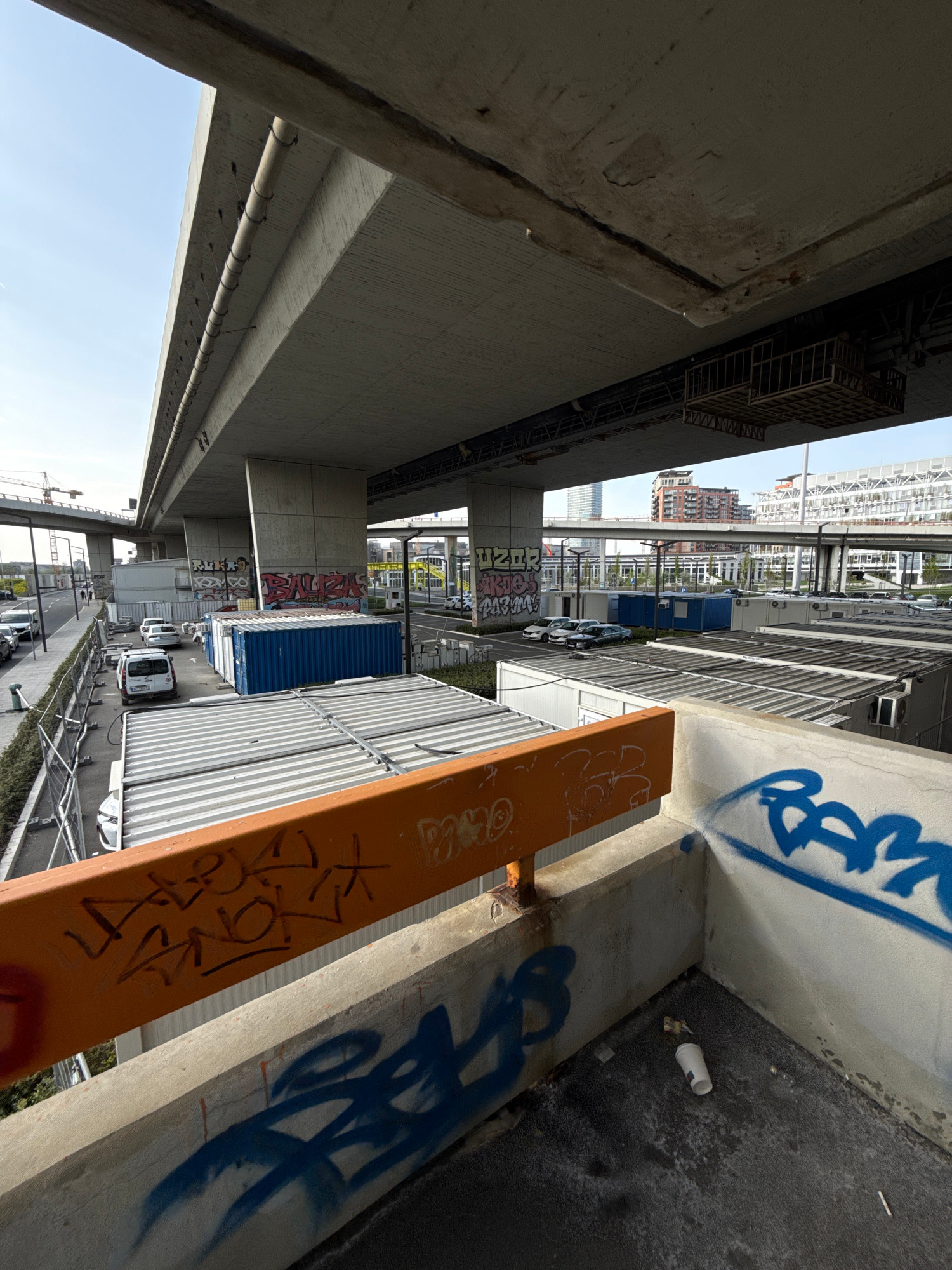 The image, captured from an elevated perspective and rotated, depicts an urban scene beneath a large concrete overhead structure, likely an elevated road or railway, in Belgrade, Serbia. The view look…read more