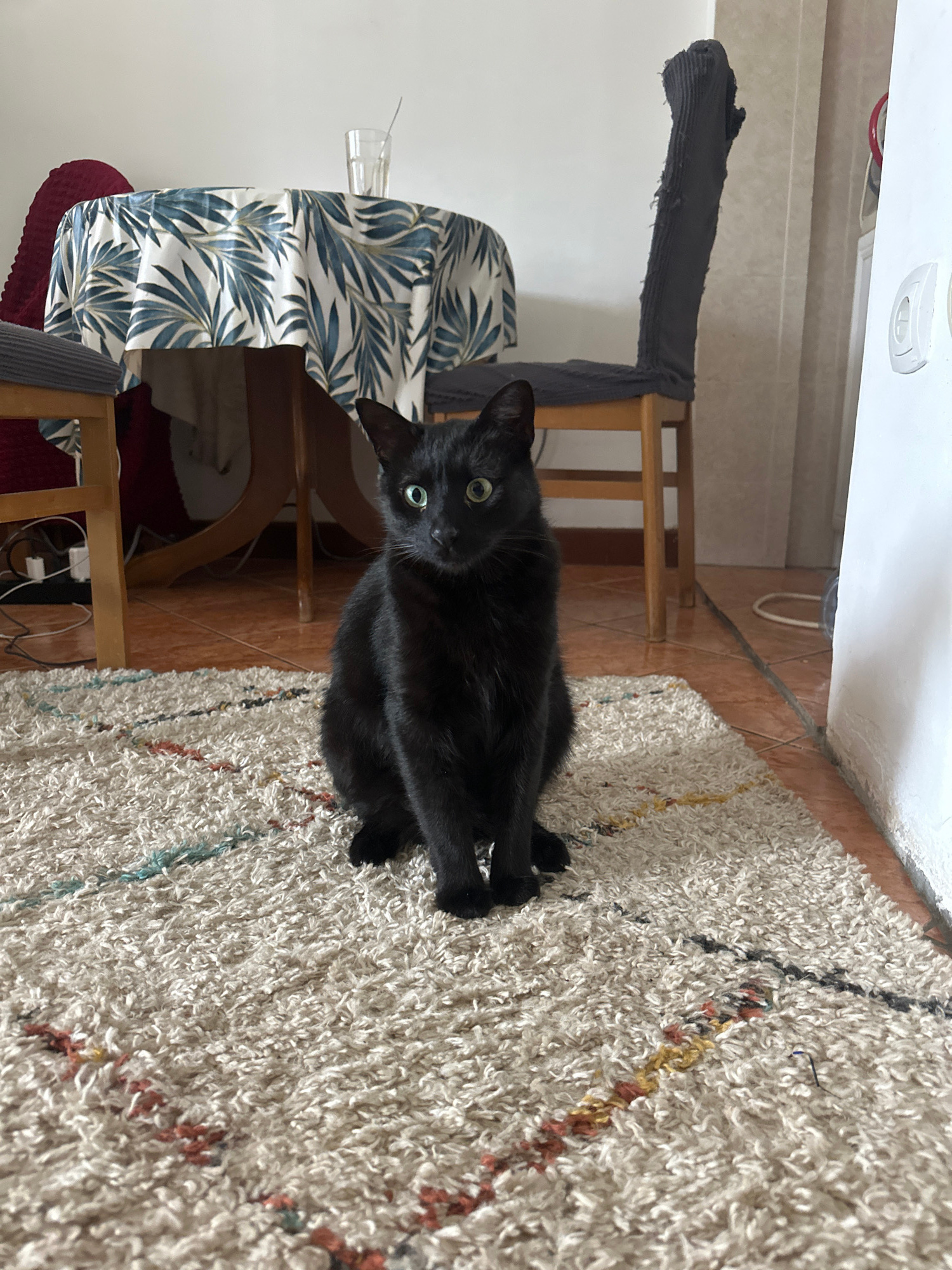A black cat sits on a multi-colored shag rug. The cat faces the camera with its head tilted to the left. The rug sits on a tiled floor, near a table with a blue and white patterned tablecloth. A woodeβ¦read more