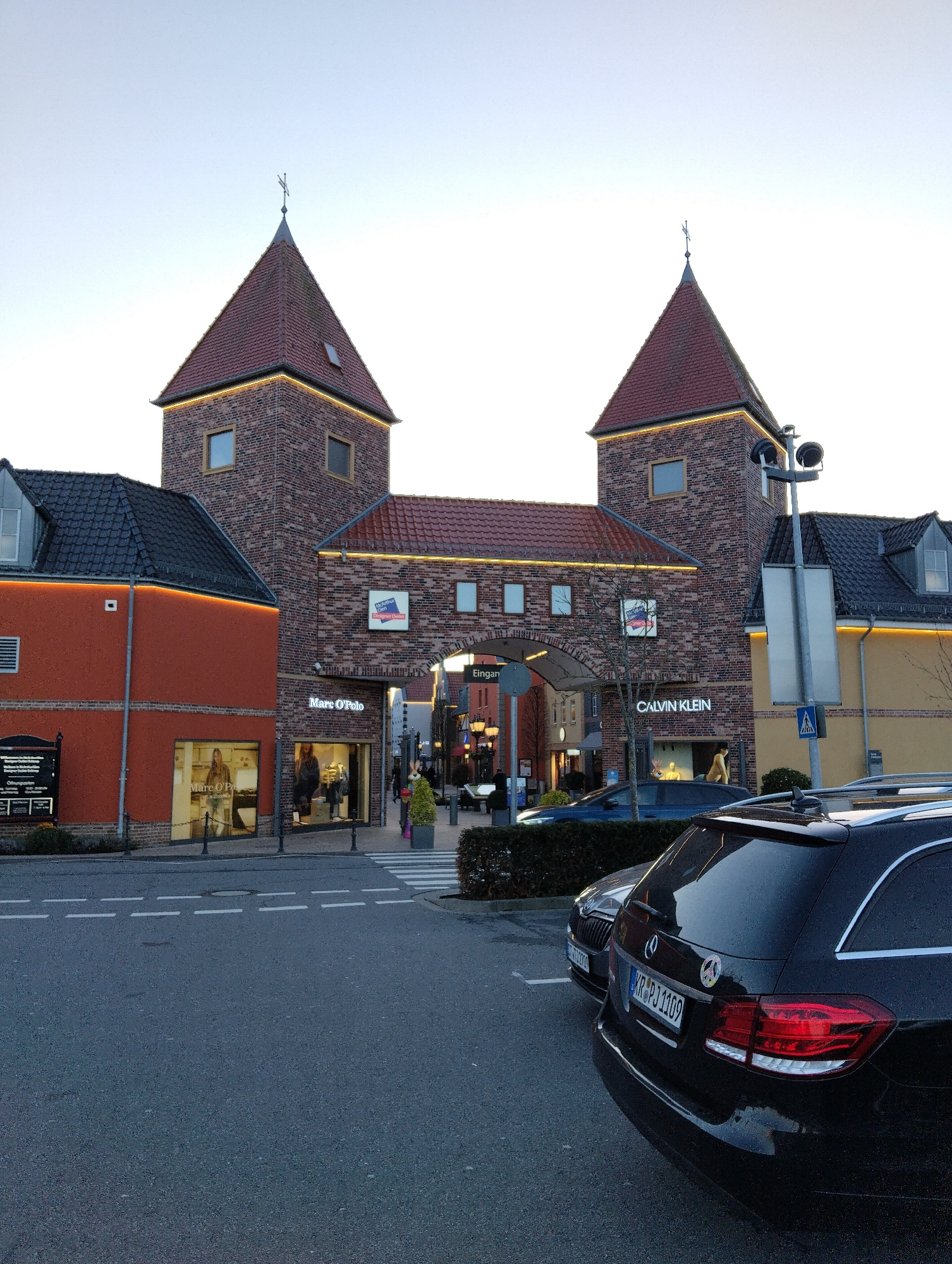 The image depicts the McArthurGlen Designer Outlet Ochtrup in Germany. The architecture features brick towers and buildings with red tile roofs, illuminated by string lights. Storefronts for Marc O'Po…read more