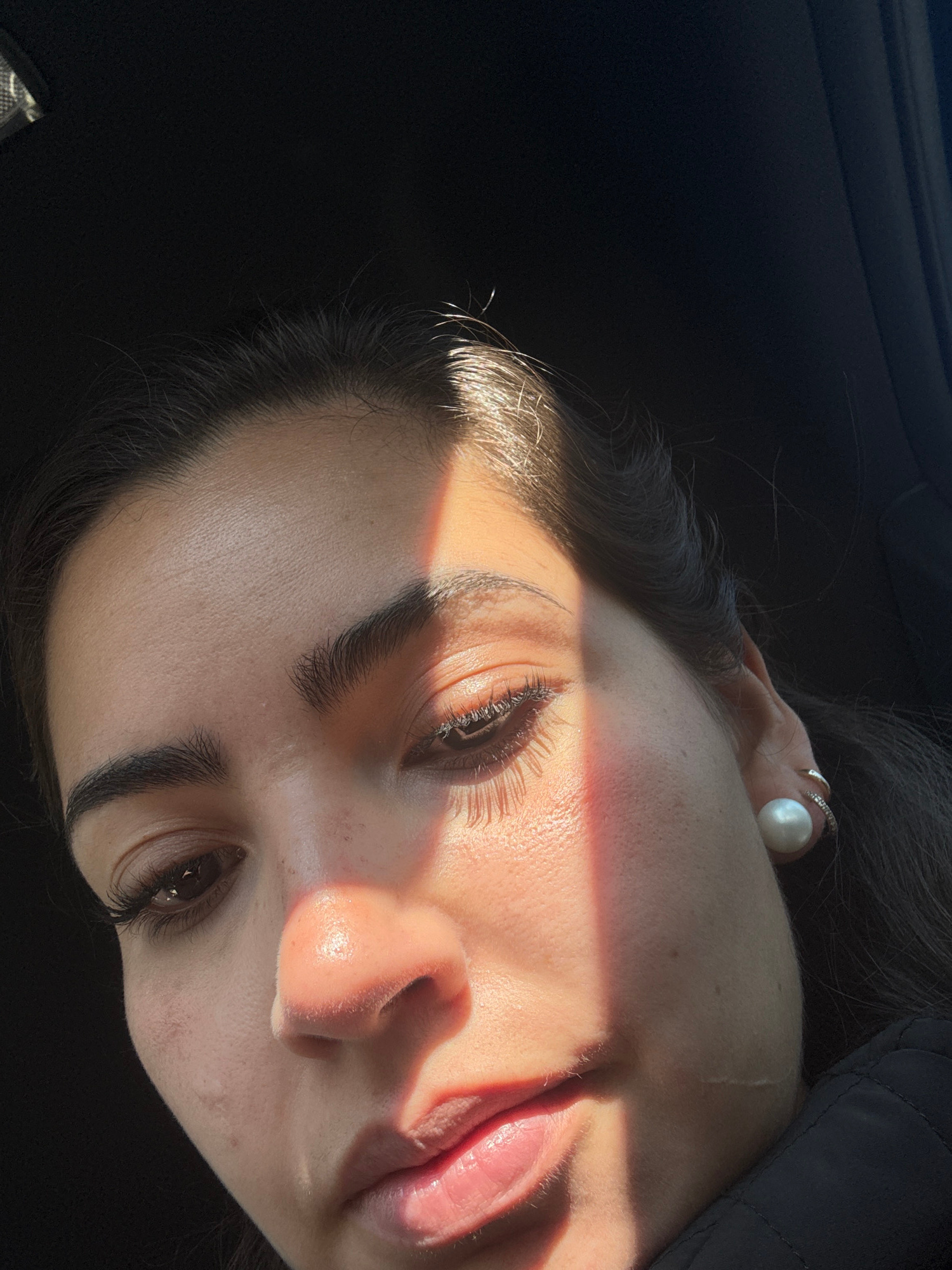 A close-up portrait of a woman's face, tilted to the right. She has dark hair and is wearing a pearl earring and a ring. Light shines across her forehead and nose. The background is dark. This is in t…read more