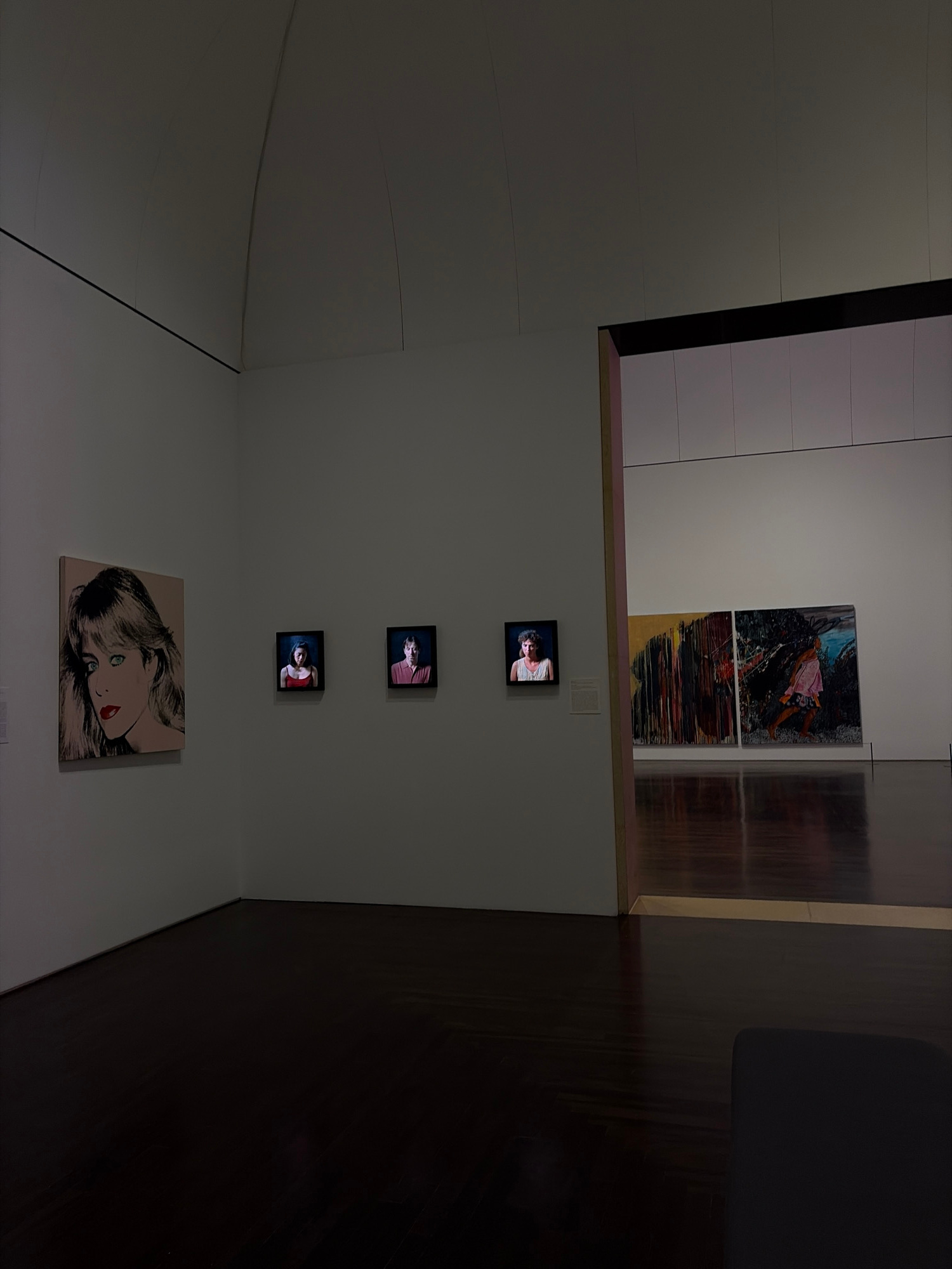 The image shows an interior space with artwork displayed on the walls. On one wall, there are three small framed portrait photographs hanging vertically above a larger canvas depicting a woman with bl…read more