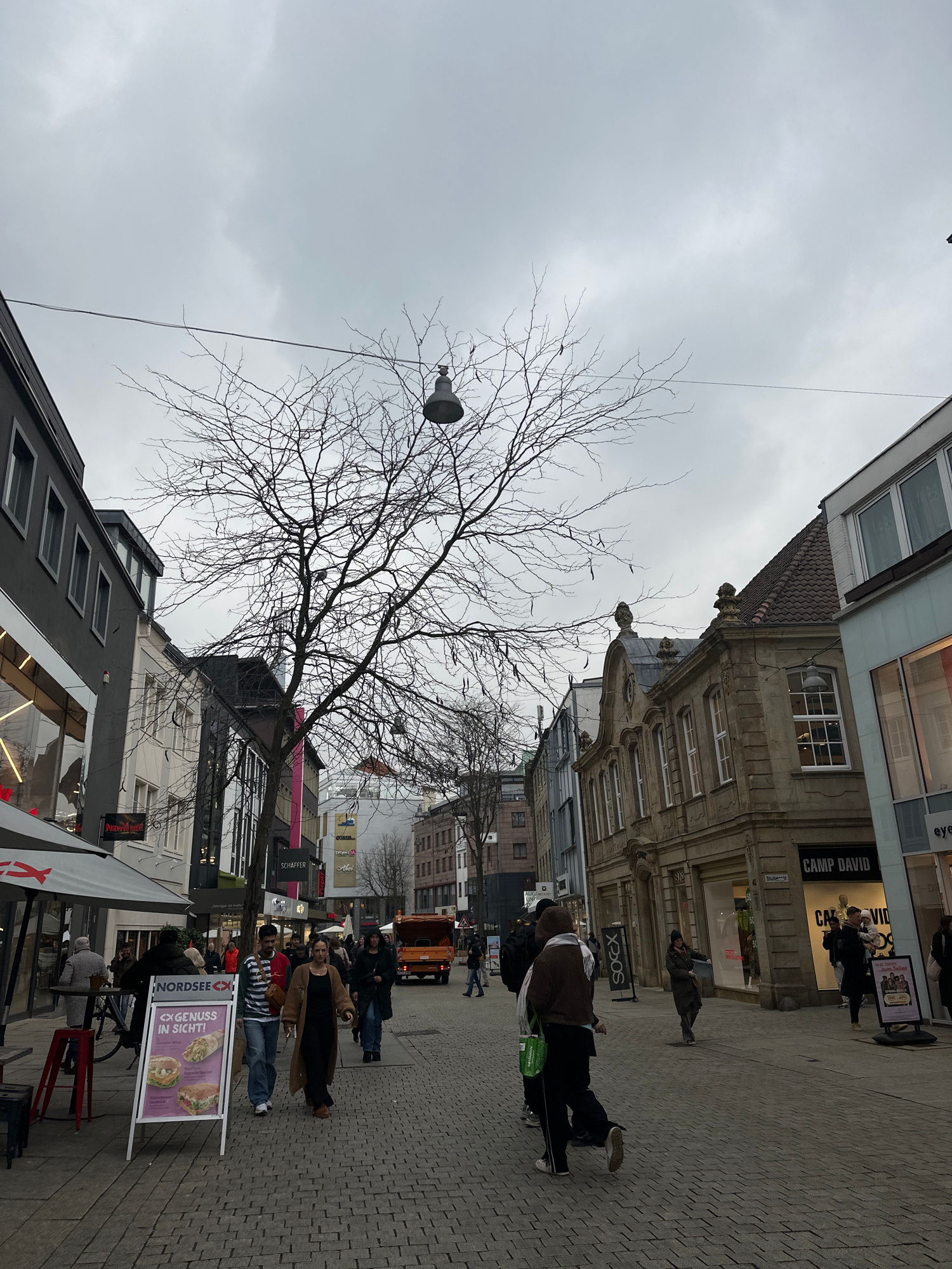 The image shows a street scene in Osnabrück, Germany, characterized by its urban setting and commercial activity. The street is lined with buildings of varying architectural styles, including older bu…read more