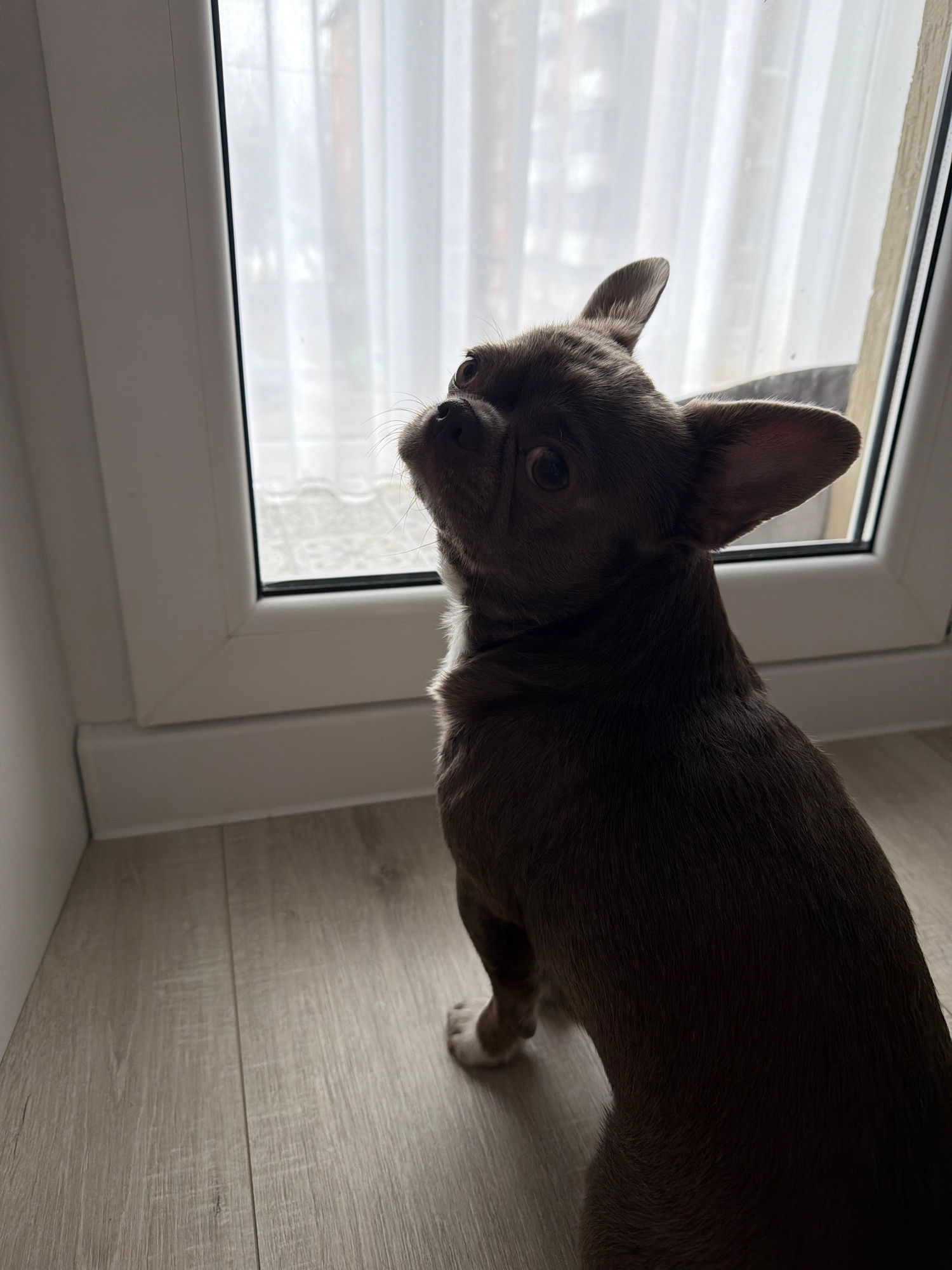 A gray-brown French Bulldog is partially visible, peering into a window. The window frame is white and the blinds behind the glass appear closed. The floor is a light wood laminate. The location is un…read more