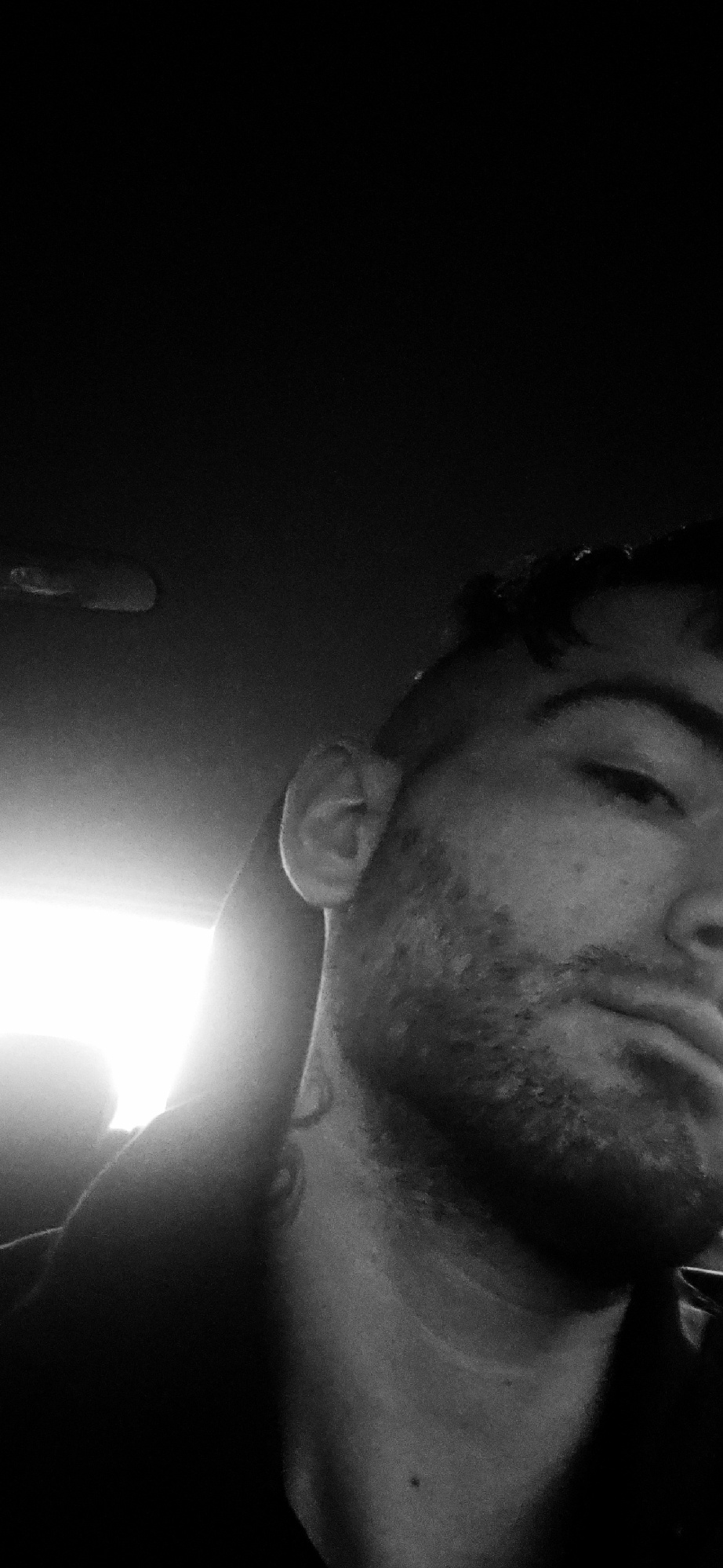 A low-angle, black and white close-up shows a person's face and upper body. The person is looking down with closed eyes, and there is a light source above. A portion of an arm is visible on the left s…read more