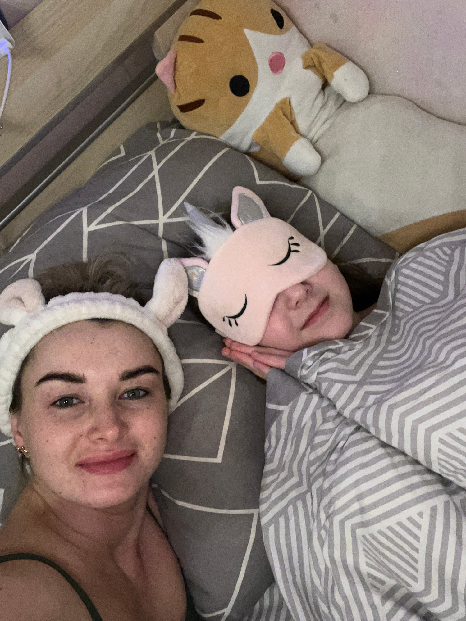 Two individuals, a child and an adult female, are lying in bed with the head of the child resting on a grey pillow with a linear white design and covered by a white-and-grey striped blanket. The childβ¦read more