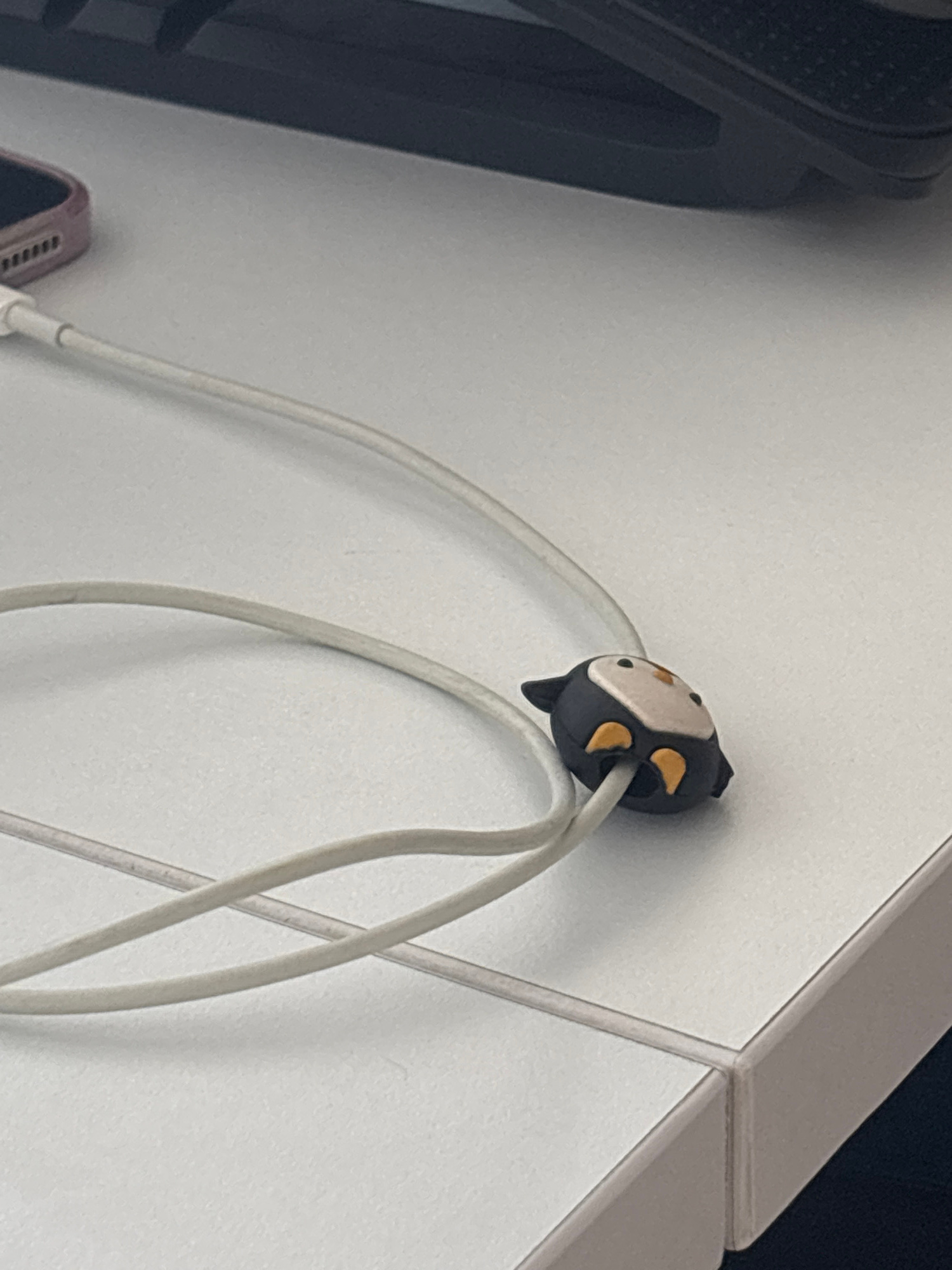 The image shows a black and white penguin-shaped cable organizer clipped onto two white cables, likely charging cables, on a white table surface. Part of a black electronic device is visible on the le…read more
