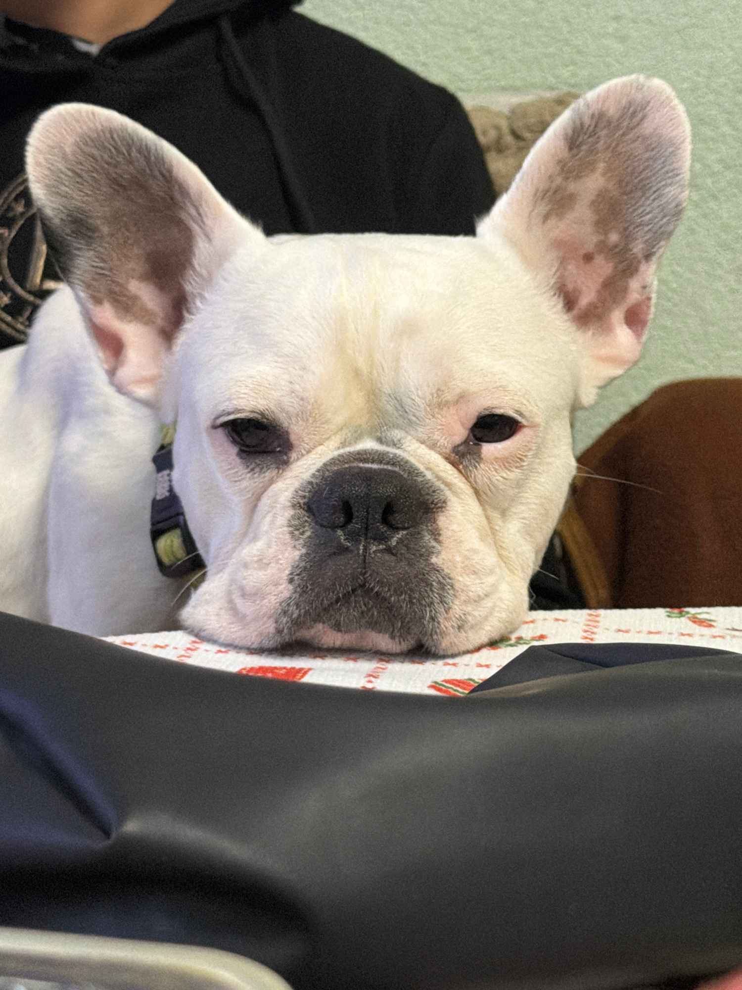 A close-up shot depicts a white French Bulldog with a black muzzle. The dog is resting its head on a surface covered with a patterned fabric, adjacent to a black object. The image does not provide any…read more