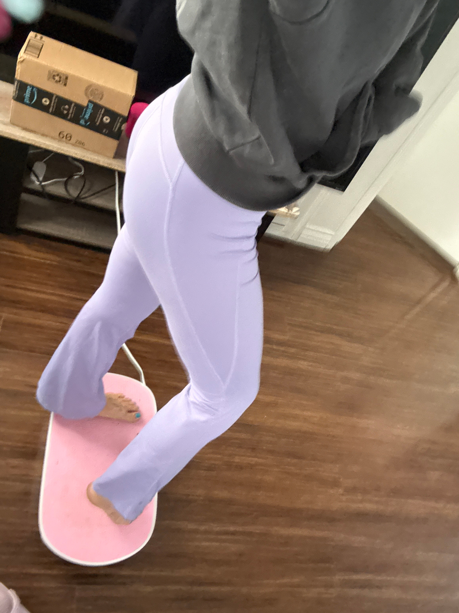 The image captures a person's lower body and mid-section engaged in an activity on a balance board, viewed from an overhead perspective and rotated on its side. The person is wearing light lavender at…read more