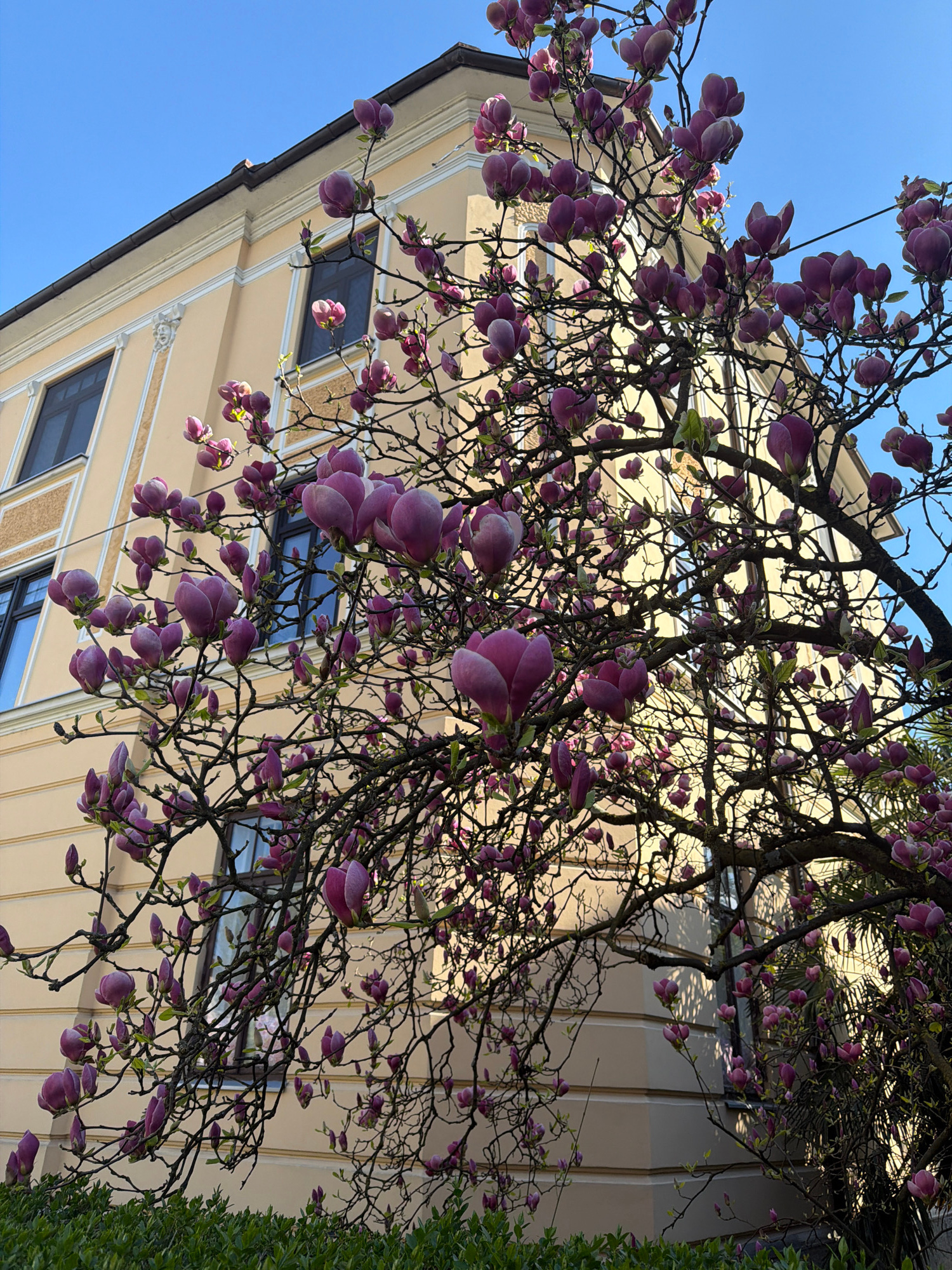 The image shows a tree with dark, bare branches filled with purple magnolia flowers in full bloom. The tree is positioned in front of a light yellow building with white trim, multiple windows, and a l…read more