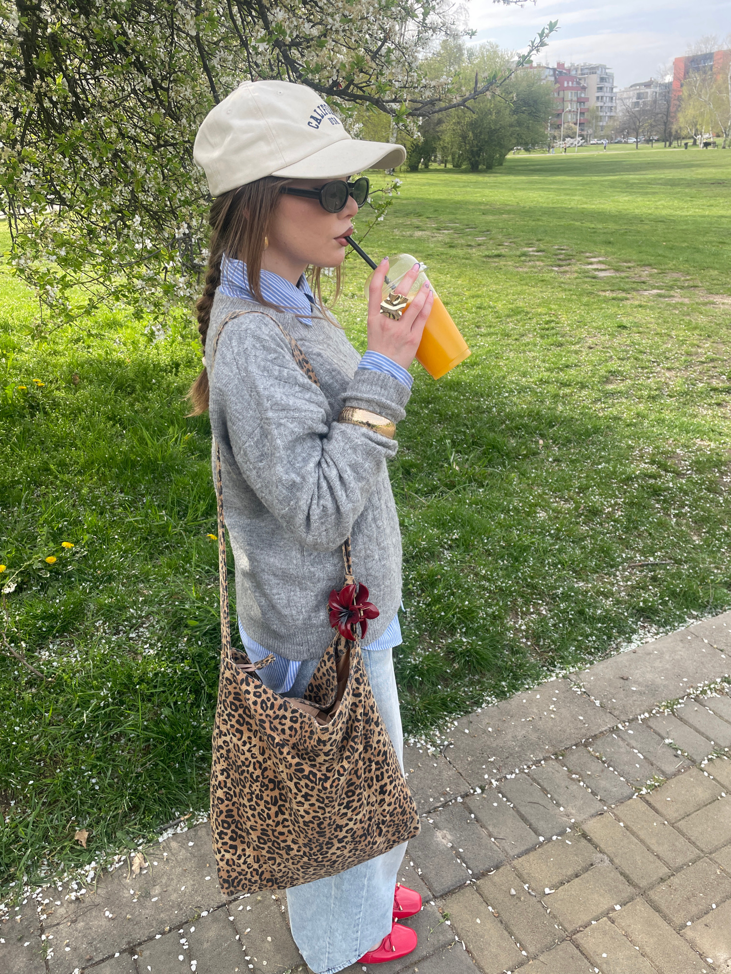 The image, rotated 90 degrees clockwise, captures a woman enjoying a drink in an urban park on a bright spring day in Sofia, Bulgaria. Seen in profile, she is mid-sip from a clear cup containing an or…read more