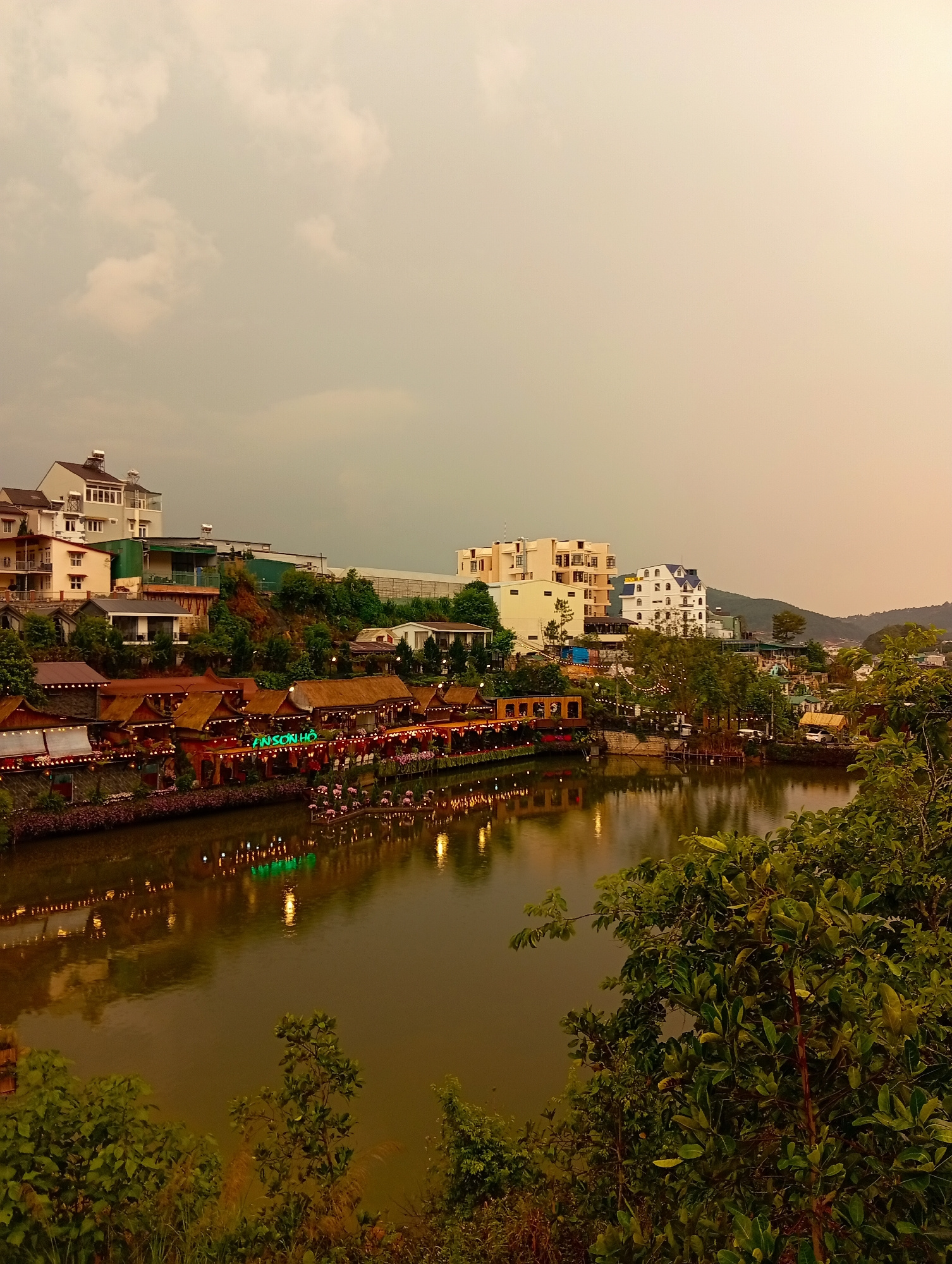 The image captures a scenic view of a lake surrounded by buildings in Da Lat, Vietnam. The sky is overcast, casting a diffused light over the scene. A row of restaurants with thatched roofs lines the…read more