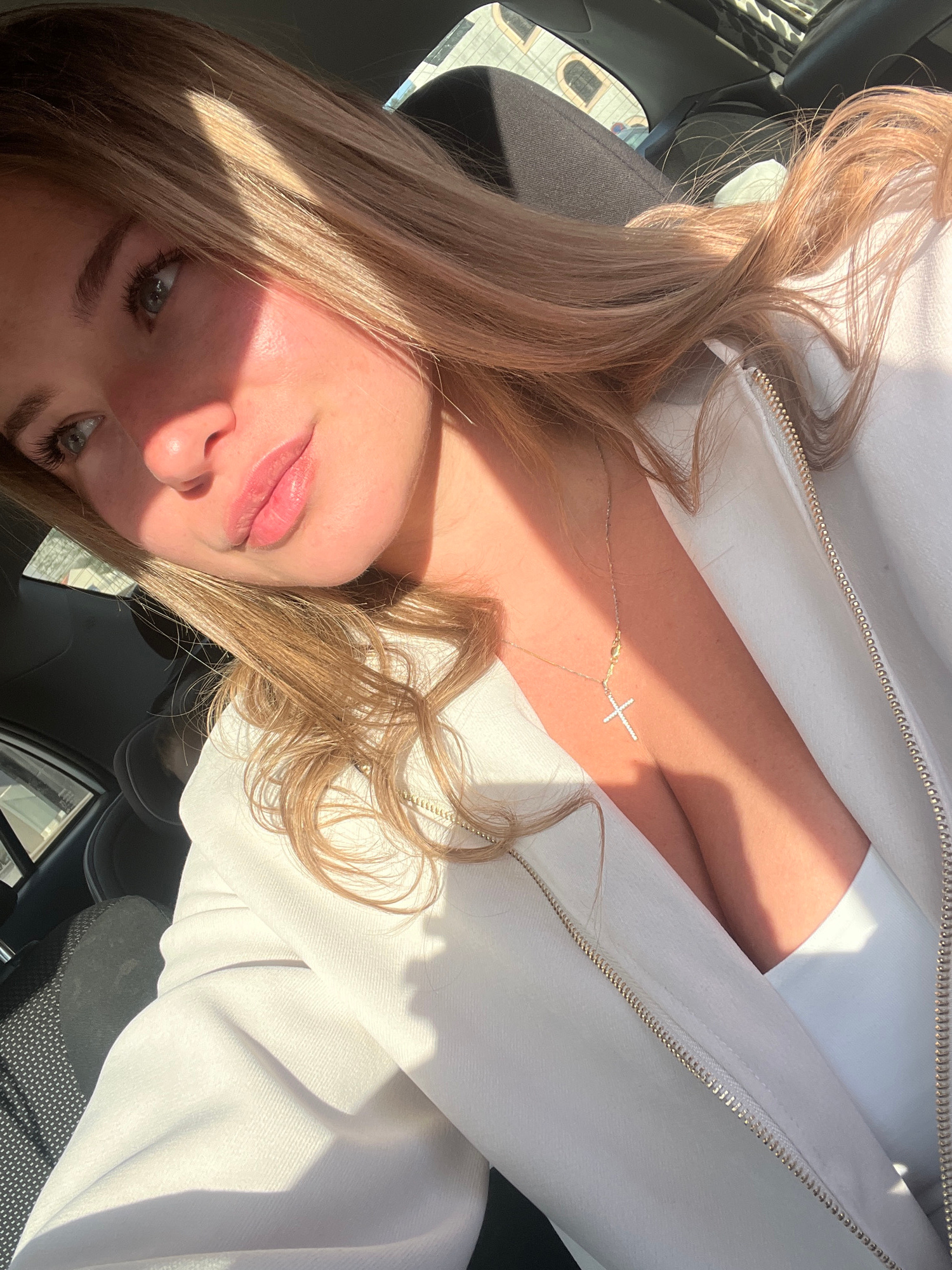 A portrait of a young woman with light-brown wavy hair is taken inside a car. She is wearing a white jacket and a delicate necklace with a cross pendant. Her face is partially illuminated by sunlight.…read more