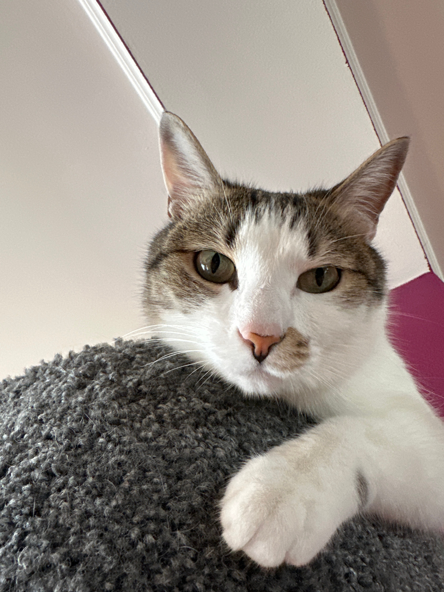 A close-up, slightly tilted perspective captures a cat lying atop a gray, carpeted surface, likely part of a cat tree or scratching post. The cat has white fur with tabby patches of gray and brown on…read more