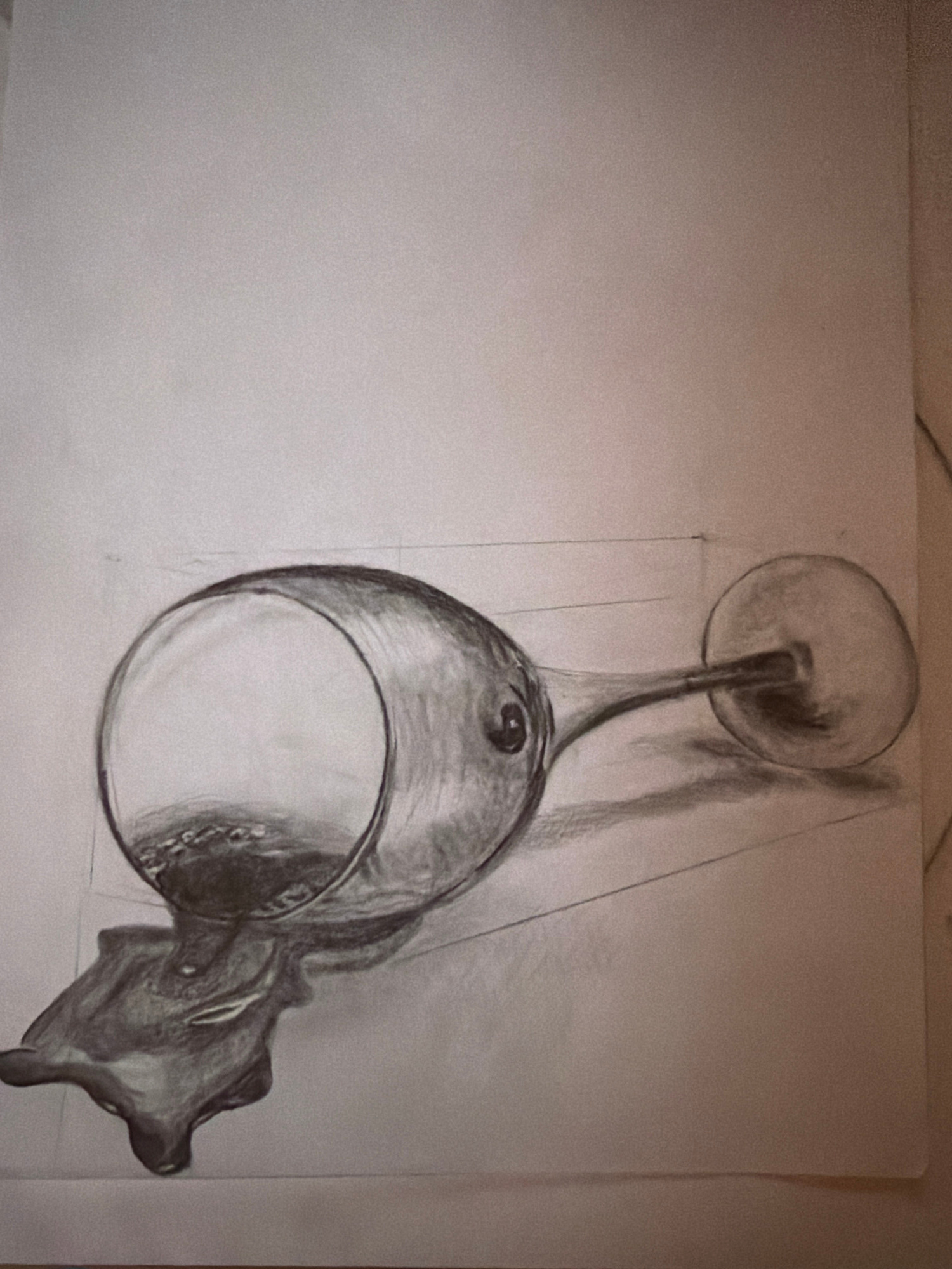 The image is a grayscale drawing of a wine glass resting on its side. The stem of the glass points upwards, with the base near the top of the image. The bowl of the glass is towards the lower right co…read more