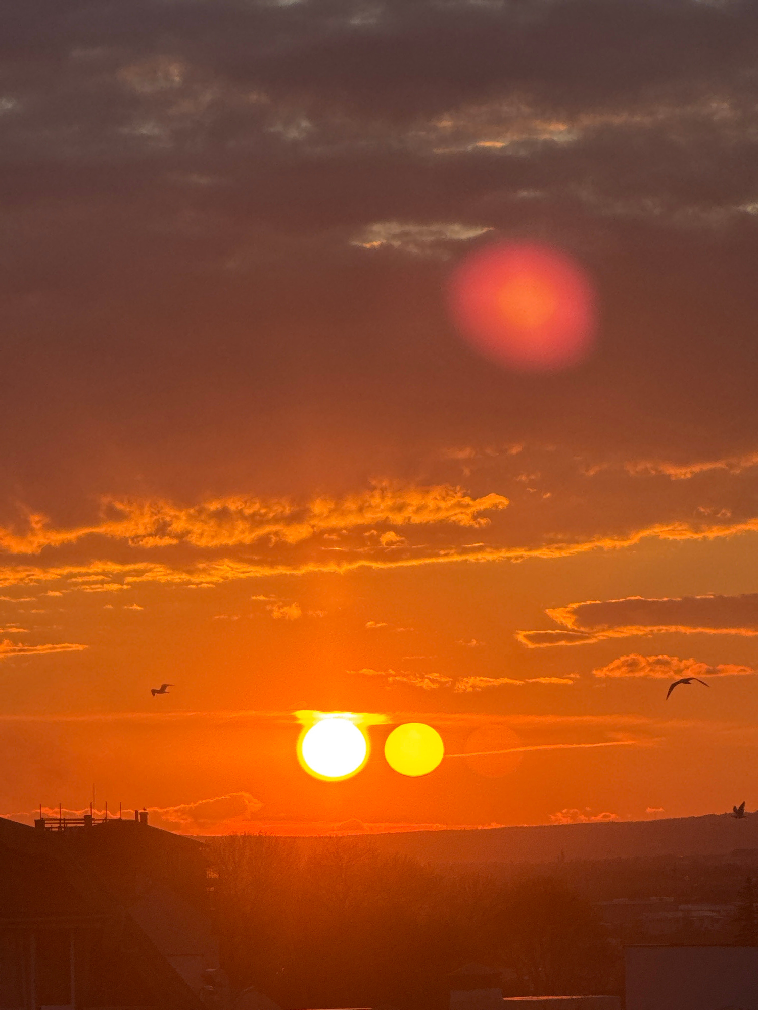 The image depicts a fiery sunset scene in Varna, Bulgaria. The sky is awash in shades of orange and red, with streaks of clouds catching the light. Two bright orange orbs, likely the sun and a reflect…read more