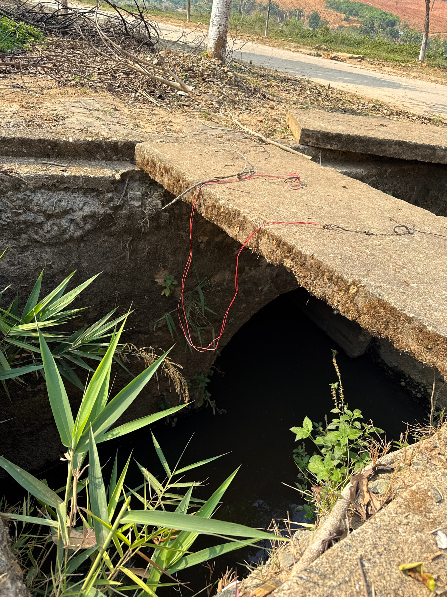 The scene is a close-up, outdoor shot of a concrete structure bordering a body of dark water. The concrete structure appears to be a bridge or a retaining wall over a drainage ditch. The concrete is w…read more
