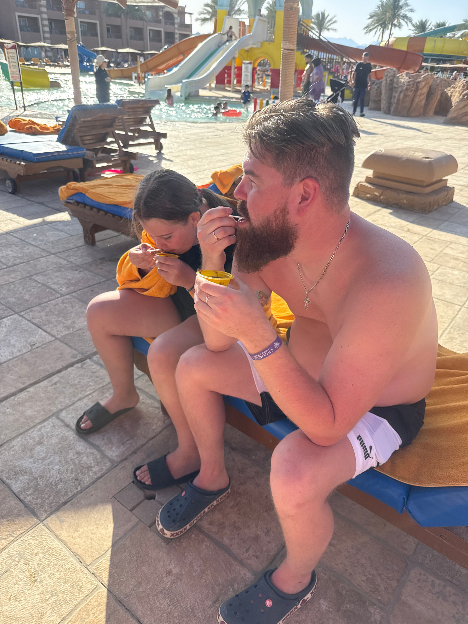 Scene at a resort in the city of Unknown, Egypt, showing a man and a woman on a lounge chair. The man, shirtless, wears black and white Puma shorts, a silver necklace with a cross pendant, and a blue…read more