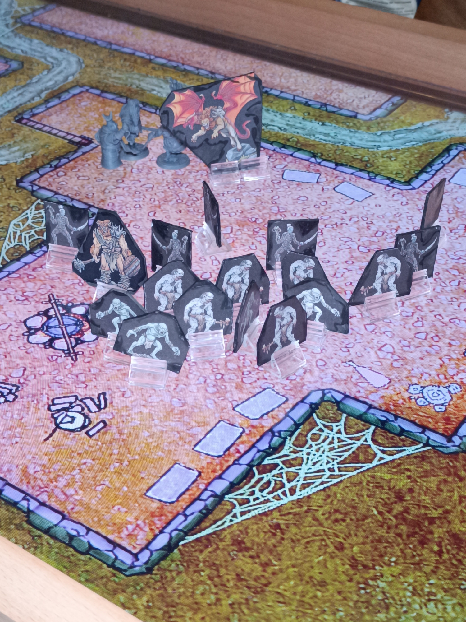 The image shows a tabletop role-playing game setup. The game board depicts a dungeon or cavern floor, with stone walls and areas marked by different terrain features, including what appears to be a st…read more