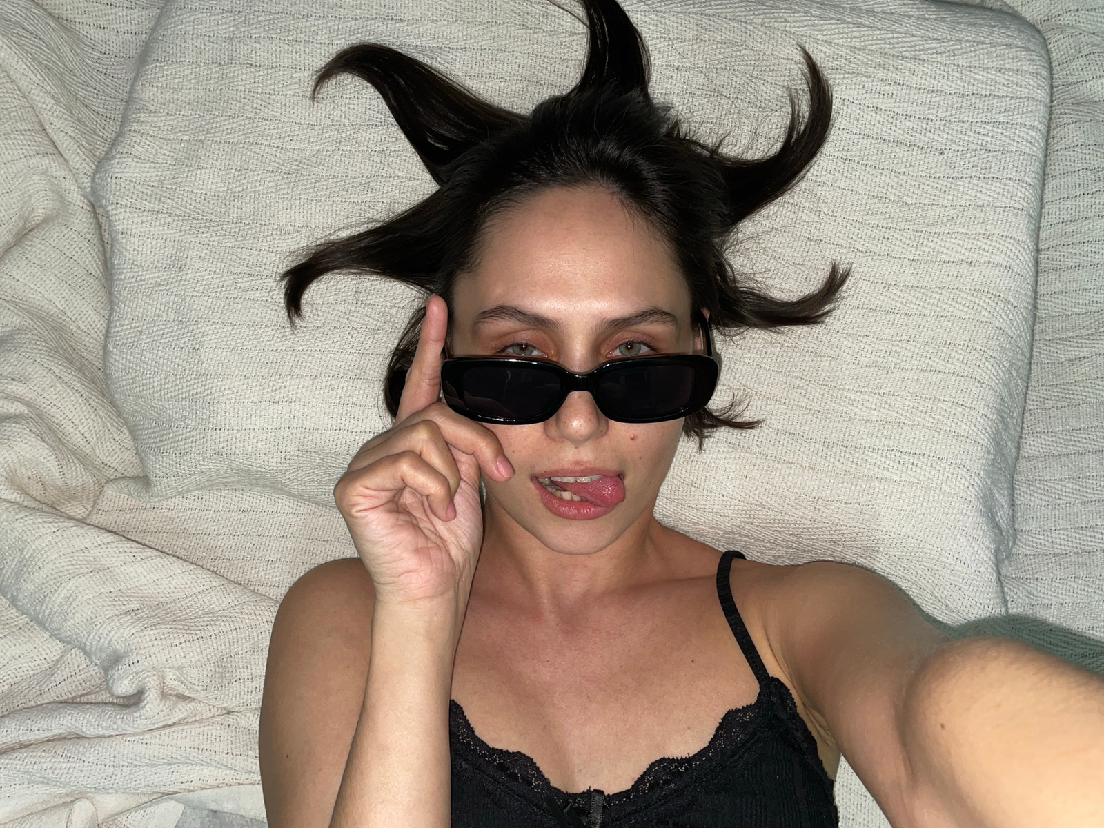 A young woman lies on a light-colored textured surface. She is wearing a black lace-trimmed camisole and black sunglasses. Her hair is styled to point outwards in several directions. She is holding up…read more