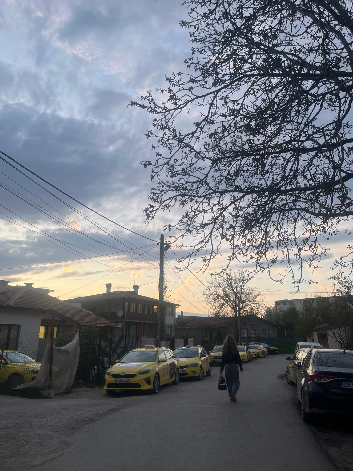The image captures a street scene in Sofia, Bulgaria, at what appears to be either dusk or dawn, indicated by the low light and the warm, yellow and orange tones near the horizon contrasting with the…read more