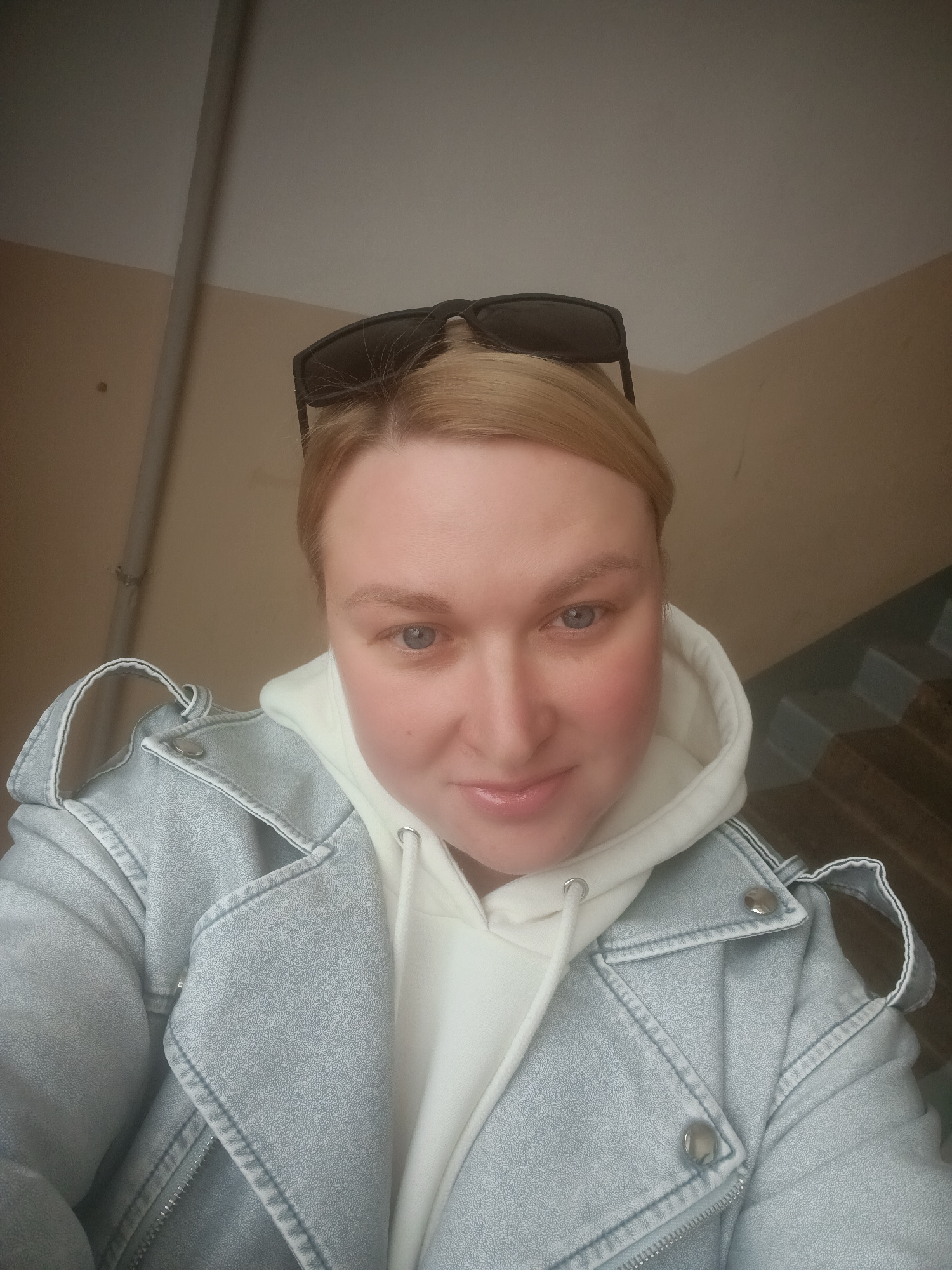 A selfie taken by a blonde woman in a light blue denim jacket over a white hoodie. She has sunglasses perched on top of her head. The background shows a wall with a light beige color and a stairwell w…read more