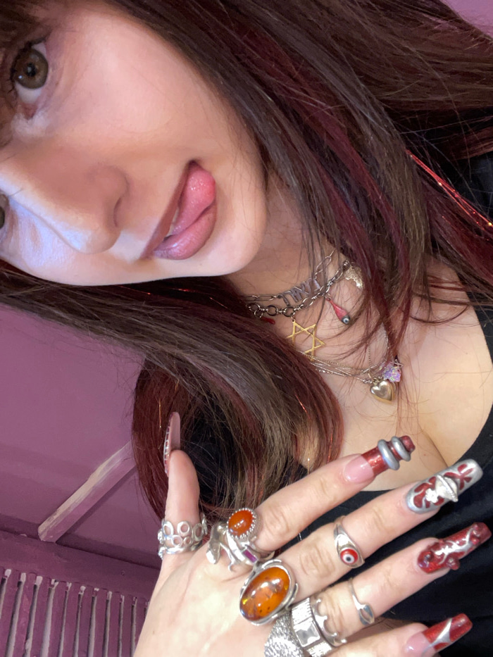 A partial portrait from an elevated, angled perspective captures a female individual with long, dark hair containing reddish-burgundy streaks and subtle glitter strands. Her left eye is visible, looki…read more