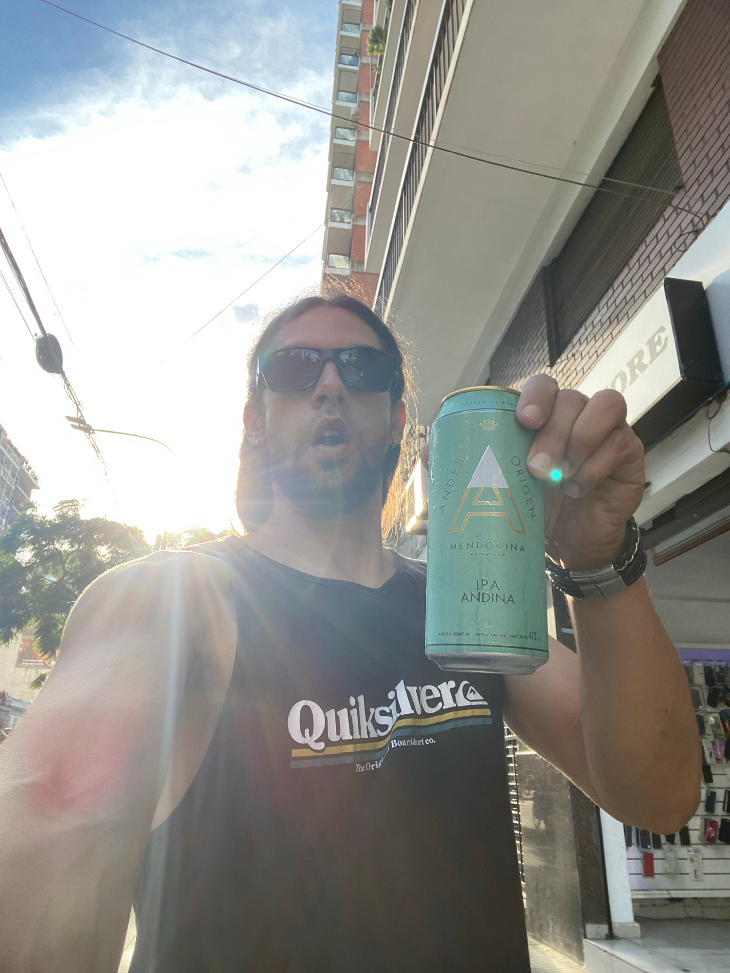 A man with long hair and sunglasses is holding a can of "Origen Andes IPA Andina" beer. He is wearing a black Quiksilver t-shirt and a watch. The background includes buildings, power lines, a storefroβ¦read more