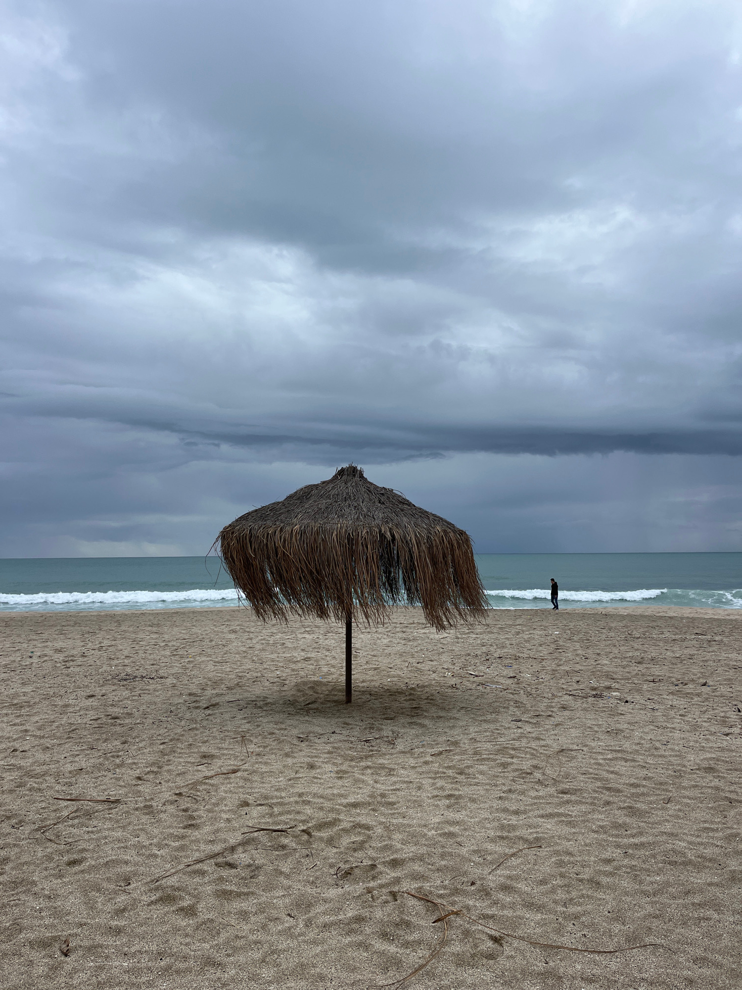 The image captures a beach scene in Alanya, Turkey. A straw beach umbrella stands prominently on the sandy shore. In the distance, a lone individual stands near the water's edge. The sky is overcast w…read more