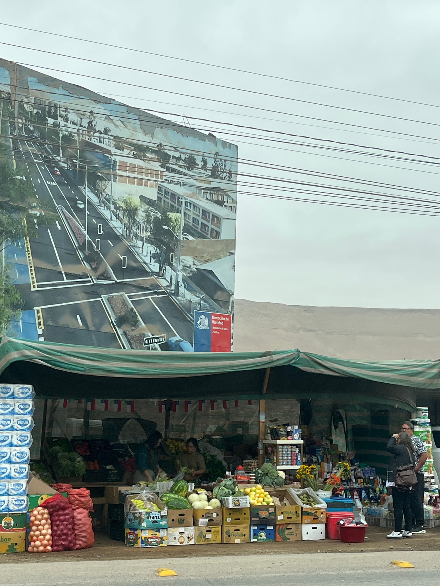 The image depicts a street scene in what appears to be Arica, Chile, showing a market stall selling produce and other goods. A person is present at the market stall, engaging with the products. There…read more