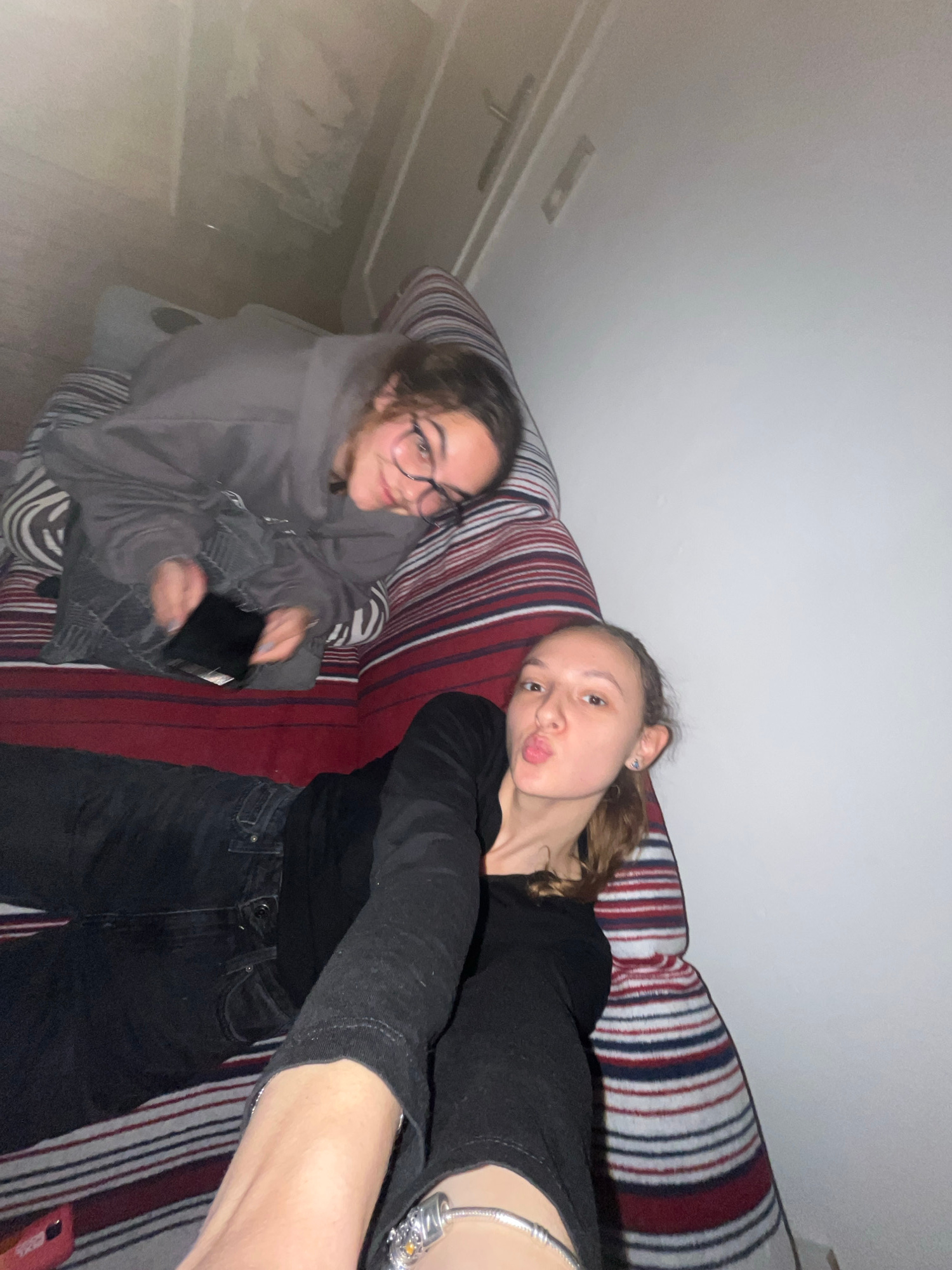 Two young women are on a couch. The woman on the left wears glasses and a grey hoodie and holds a mobile phone. The woman on the right wears a black shirt and black jeans. The couch has red, white and…read more