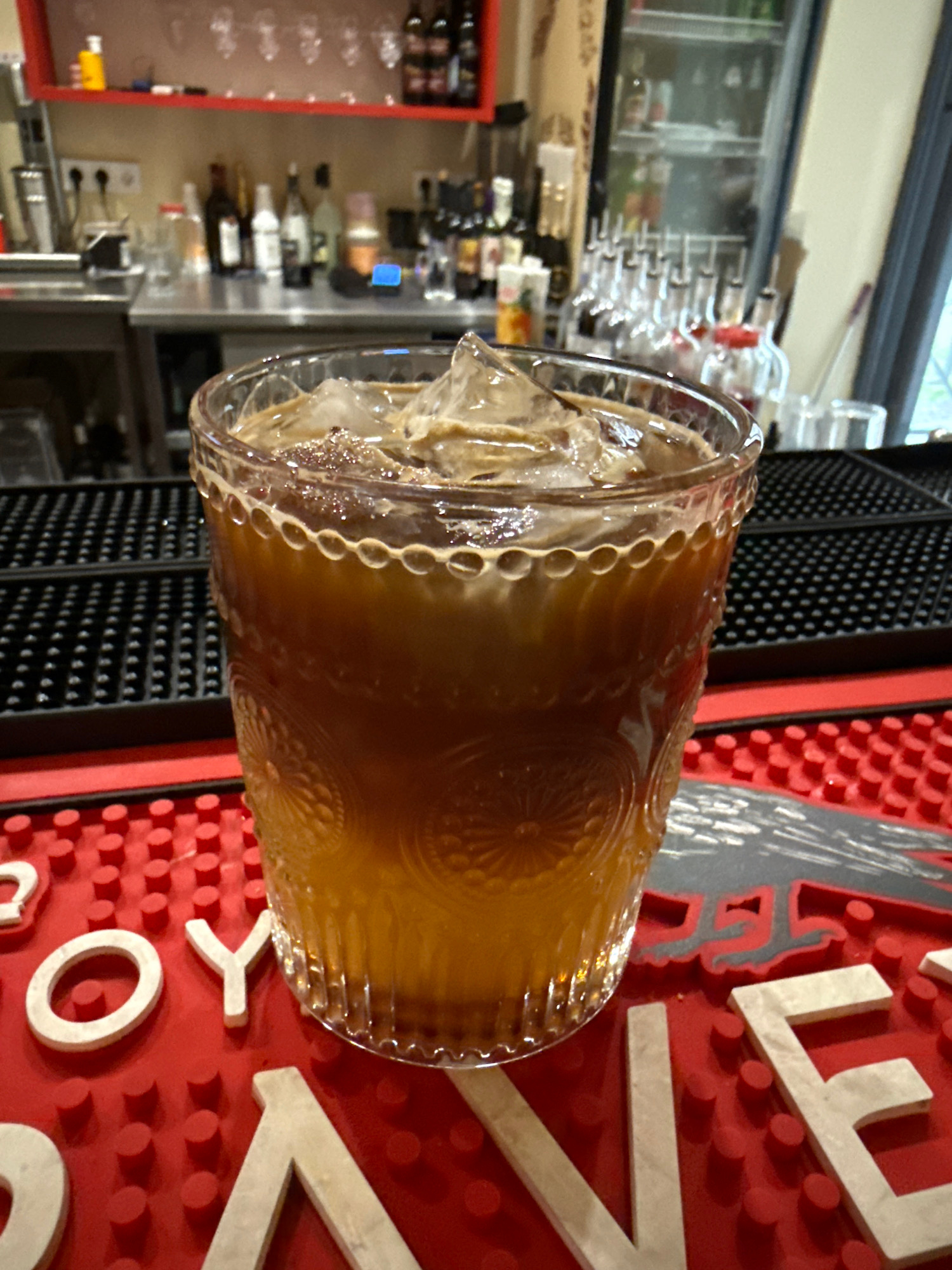 A close-up shot shows an ornate glass filled with a brown liquid and ice, likely a cocktail, resting on a red rubber bar mat with white lettering that reads "Donetsk." Behind the glass are elements of…read more