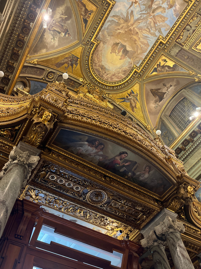 The image captures a highly ornate, gilded interior, specifically identified as the Salone di San Luigi (Hall of Saint Louis) located within the Royal Palace of Naples, Italy. The perspective is an up…read more