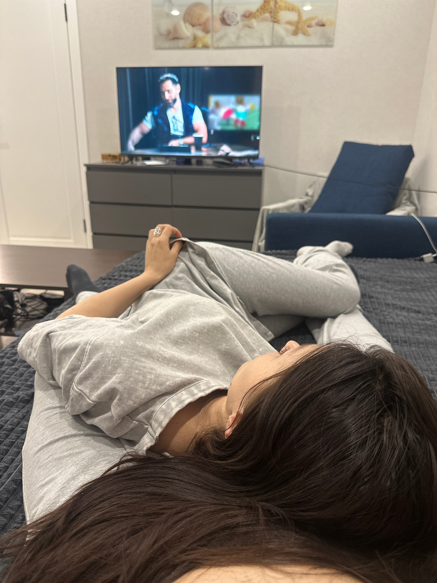 An overhead shot shows a woman relaxing indoors, presumably in a bedroom or living area in Murino, Russia. She is captured from behind and slightly to the side, revealing her long, dark hair. She wear…read more
