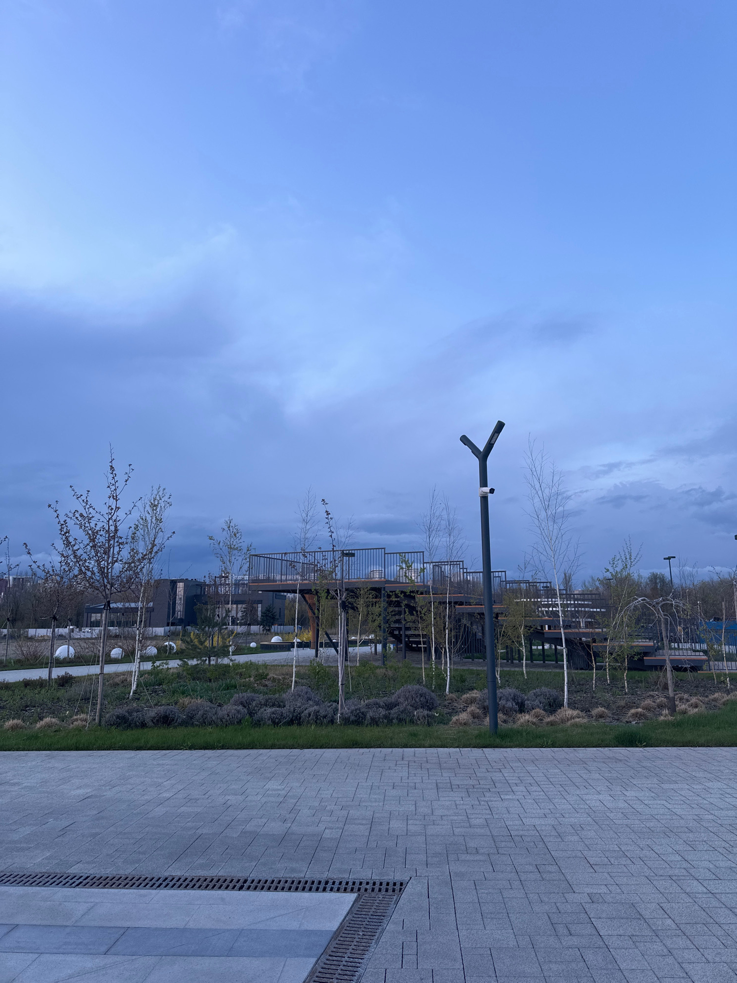 The image shows a park in Rostov-on-Don, Russia. A grey brick path runs along the right side of the frame. Next to the path is a narrow strip of grass and small trees. A black lamppost stands near theβ¦read more