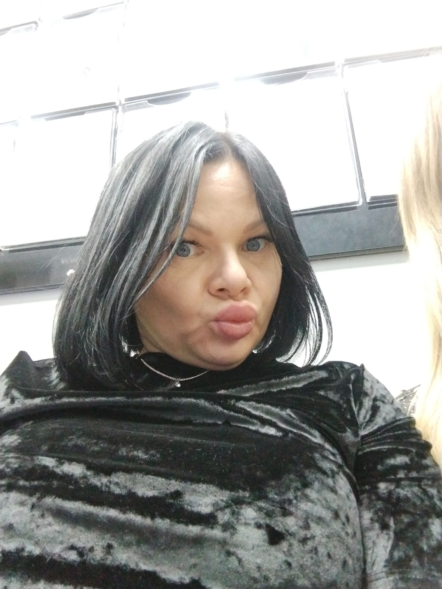 A medium close-up, slightly high-angle indoor portrait features a woman with dark, medium-length hair and striking blue eyes, looking directly at the camera. She is making a "duck face" expression by…read more