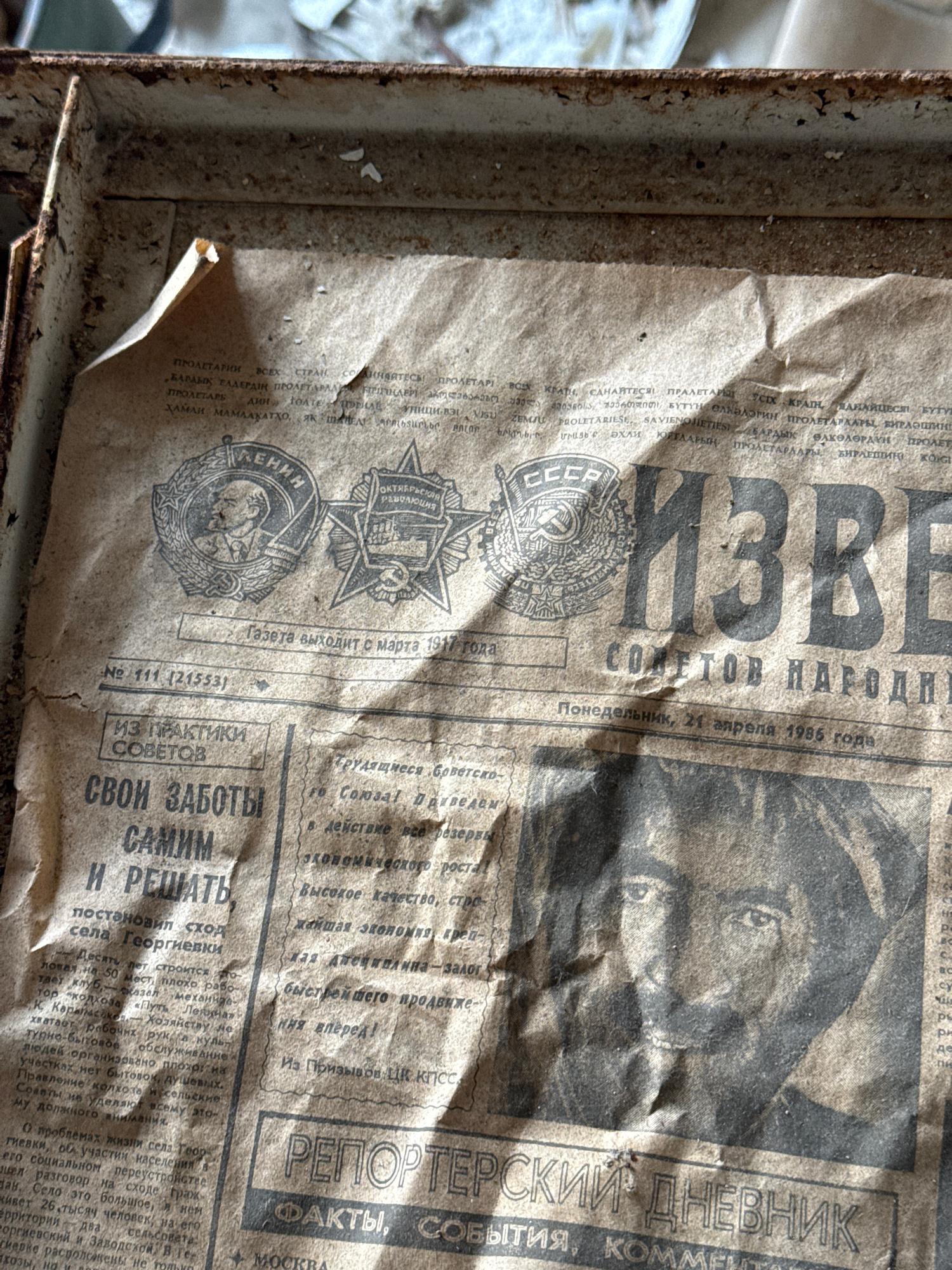 The image captures a section of the Soviet-era newspaper "Izvestia", dated April 21, 1986, encased in a rusted metal frame. The newspaper's masthead is prominent, followed by the subtitle "Soviets of…read more