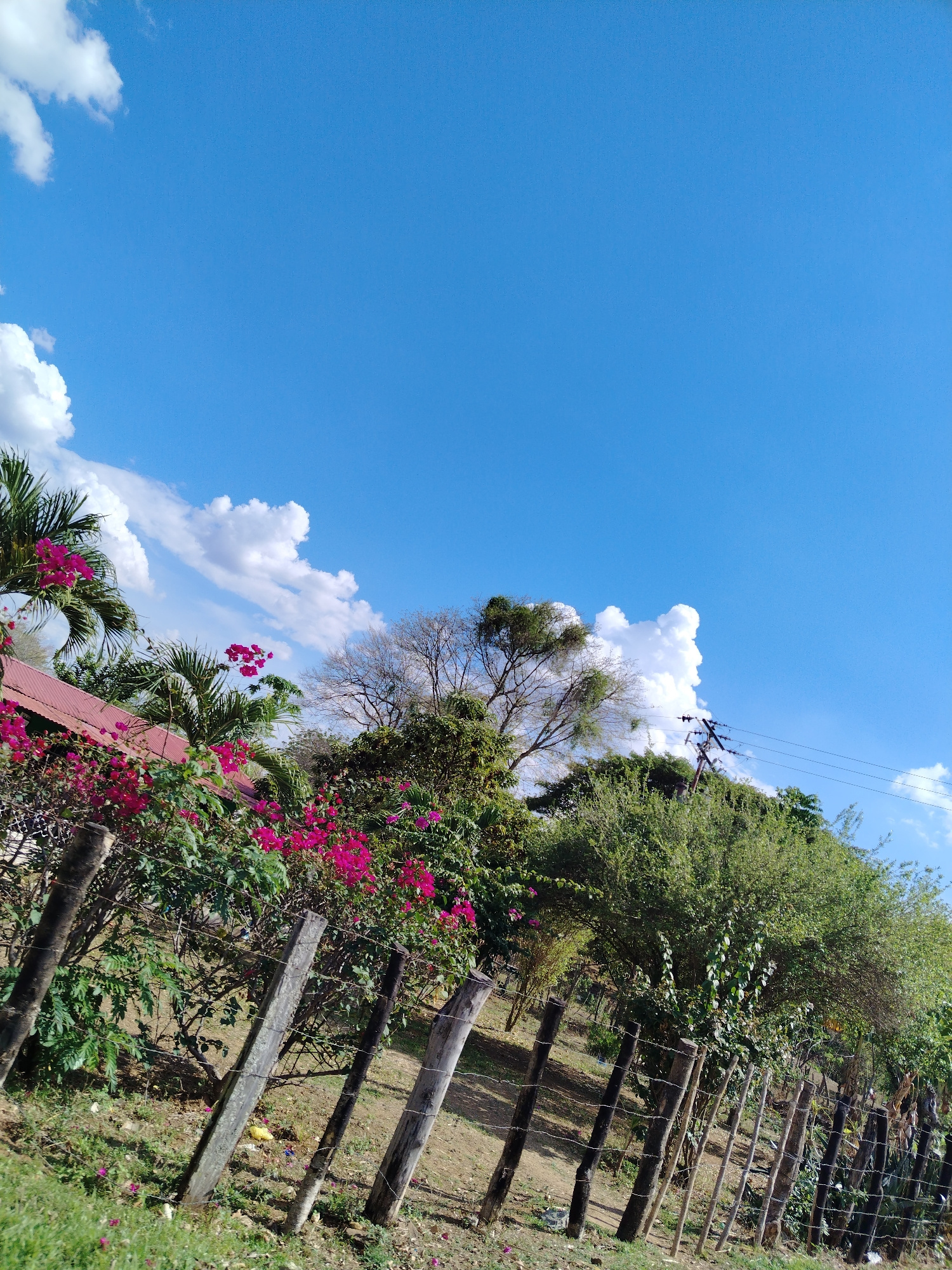 The image captures a rural scene in Las Mesas, Venezuela. In the foreground, a weathered wooden fence runs diagonally across the frame, separating a grassy area from a slightly higher terrain. Lush gr…read more
