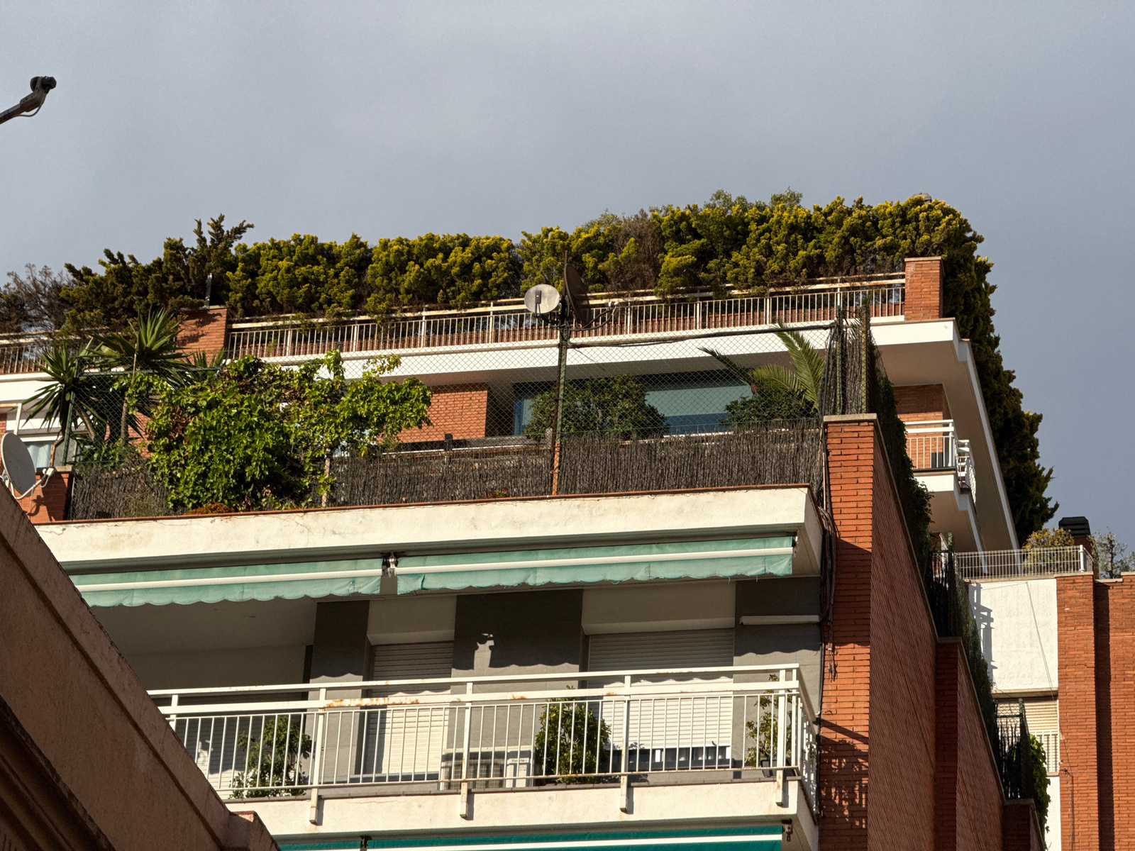 This image presents a close-up view of a multi-story residential building, likely located in Barcelona, Spain. The architecture features stepped terraces and balconies, constructed with a combination…read more