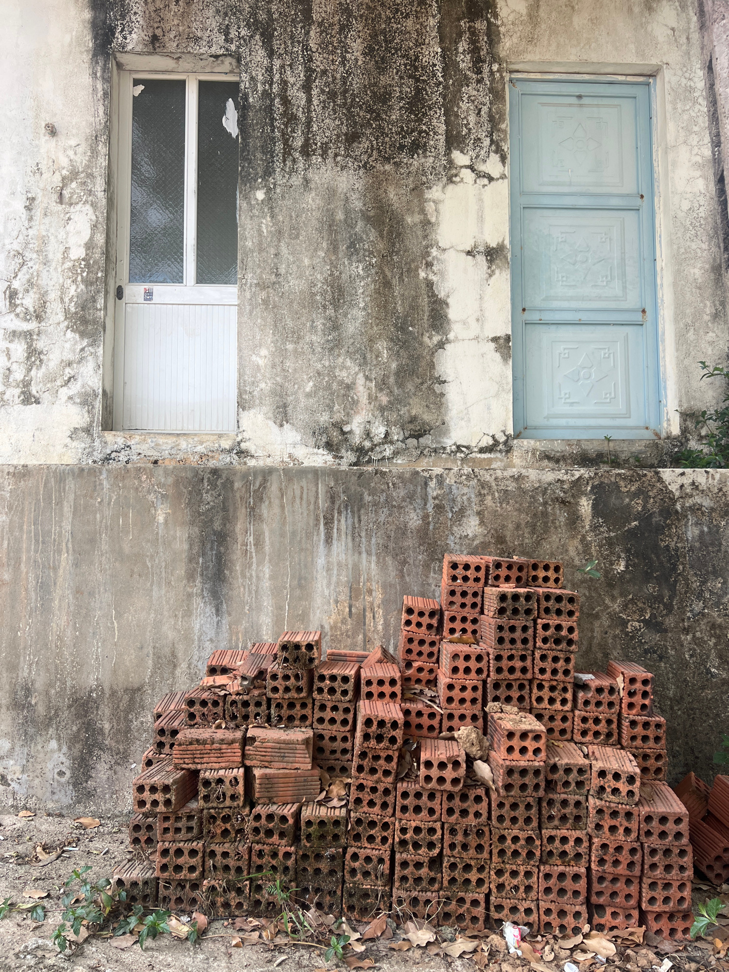 The scene appears to be an exterior shot of a building in Bo Y, Vietnam. The building has a weathered concrete facade with two windows, one with a light blue frame and decorative panels, and another,…read more