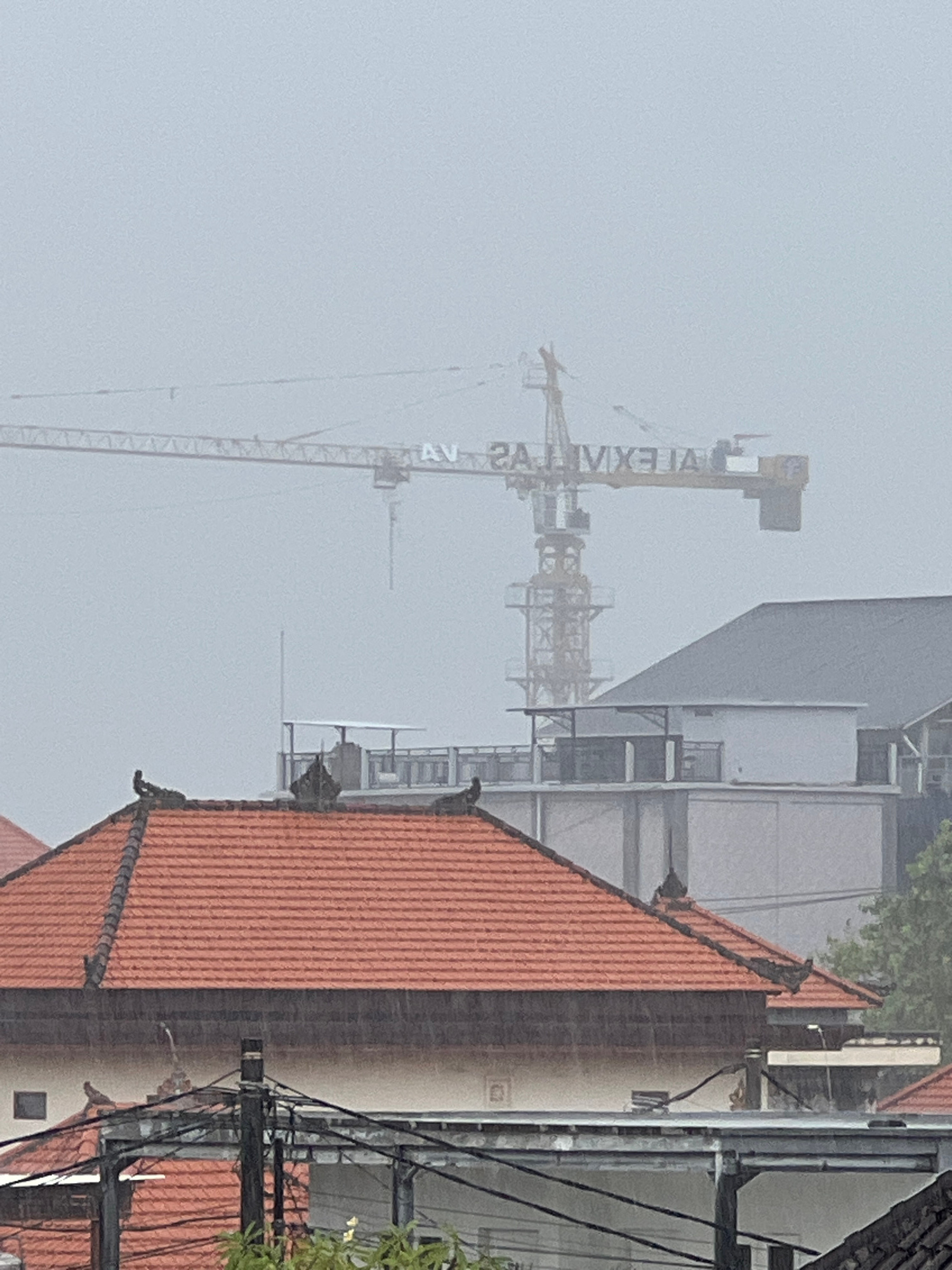 The image captures an outdoor scene dominated by a construction site under heavy mist or fog. In the foreground on the right, a prominent building features a reddish-orange tiled gabled roof. Portions…read more